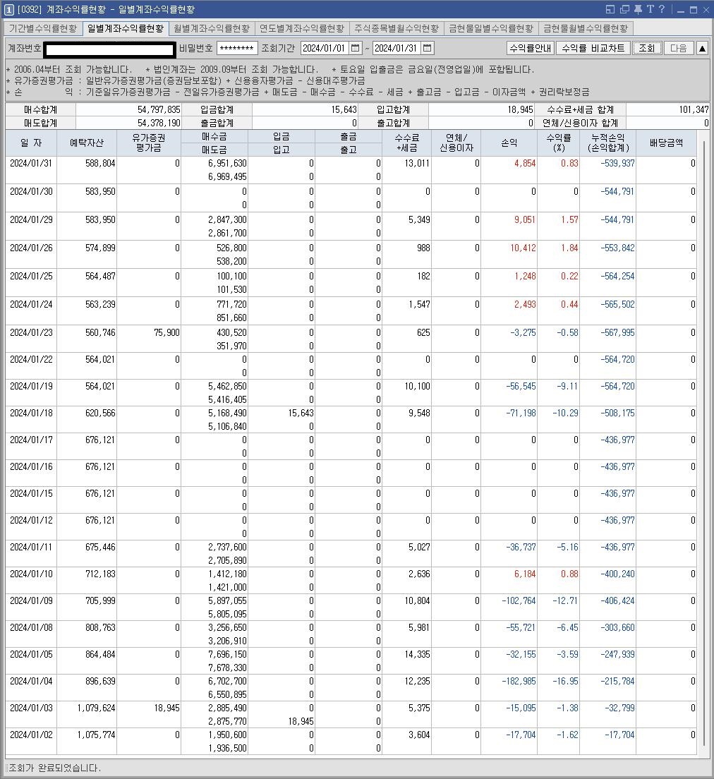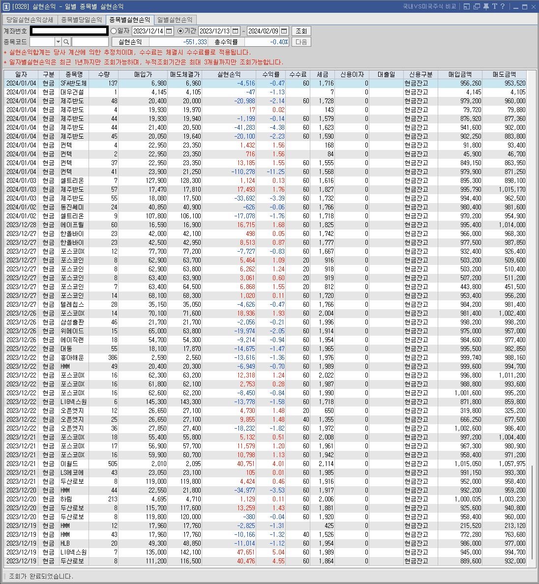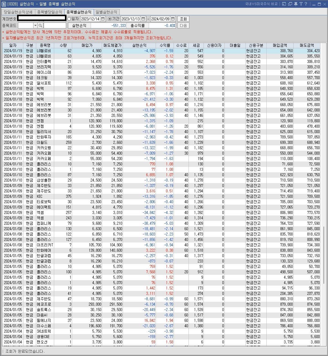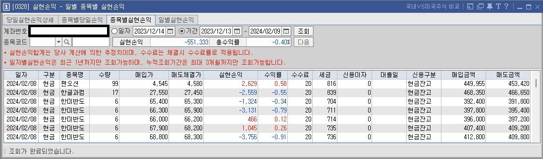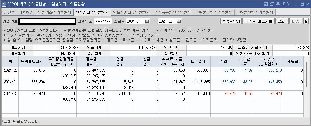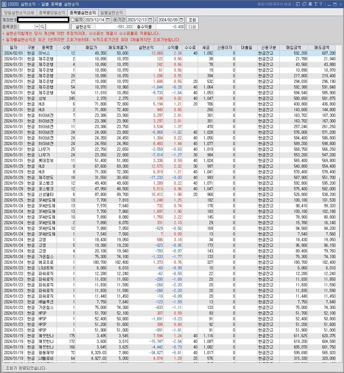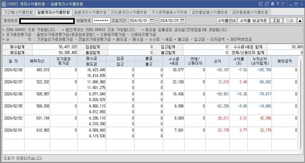 여러 가지 책도 보고 유튜브도 보고 매매를 했지만 2024년 2월 9일 현재 입금액의 51.69% 손실 중