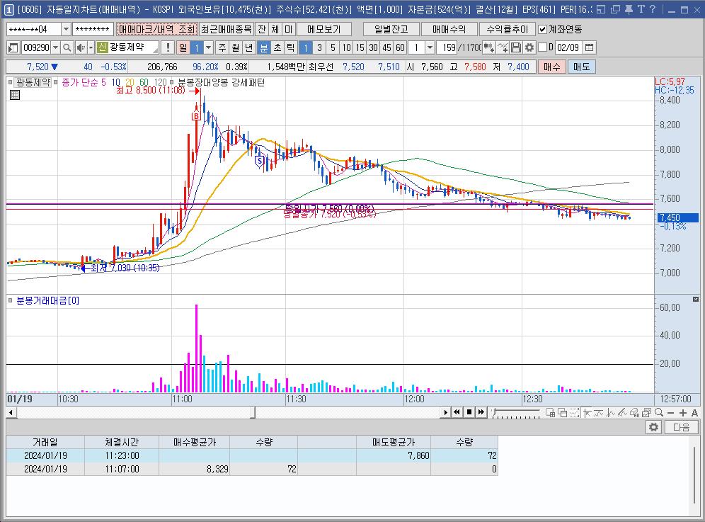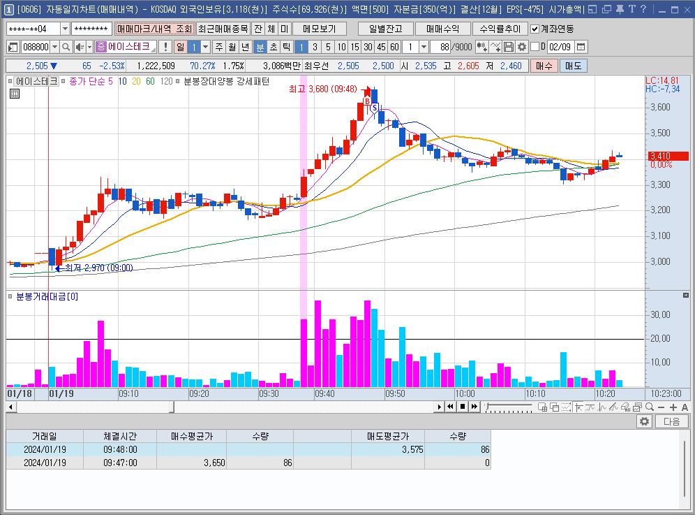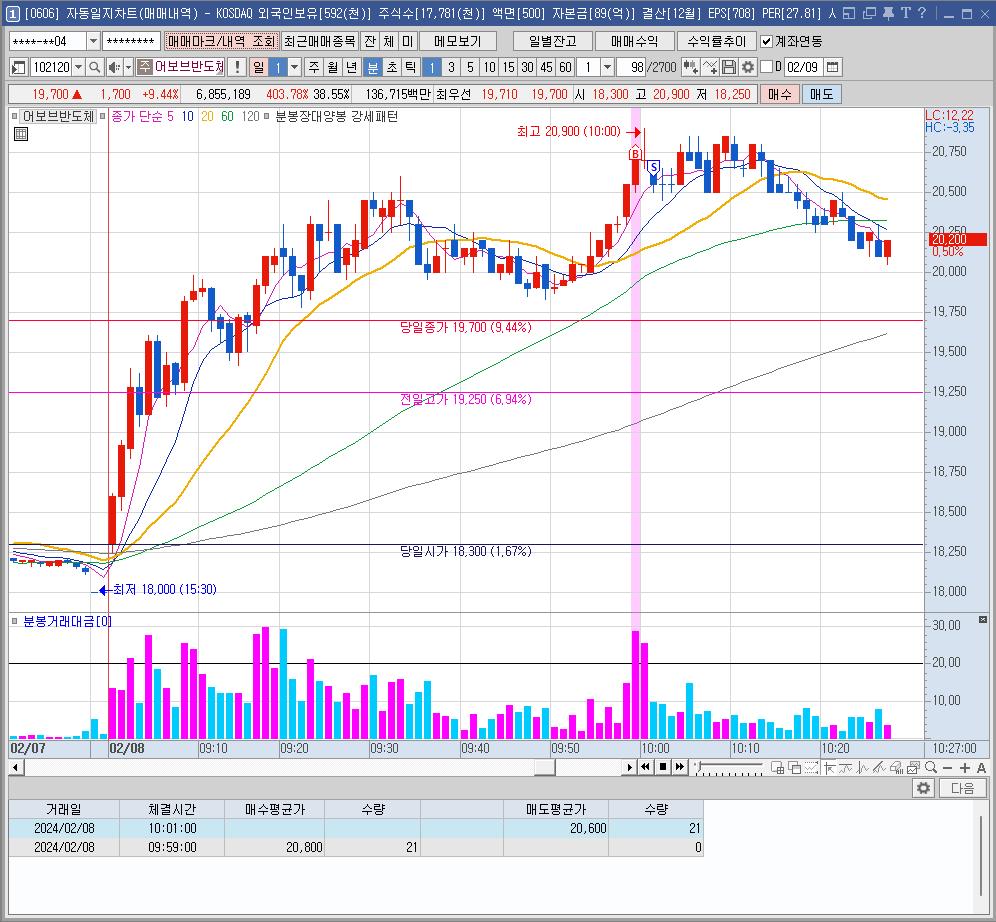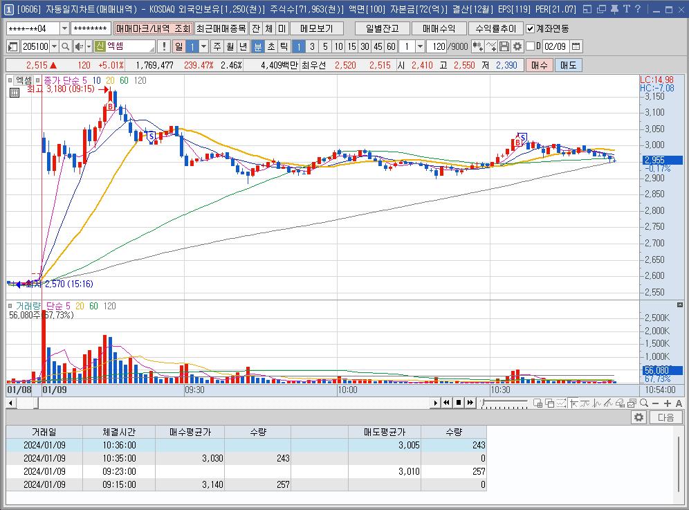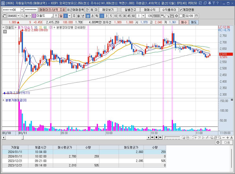 종목선정 실패? 완만하게 오르는 종목은 매수 진입이 어렵다(공부가 더 필요하다). 전체적인 흐름파악 못함.