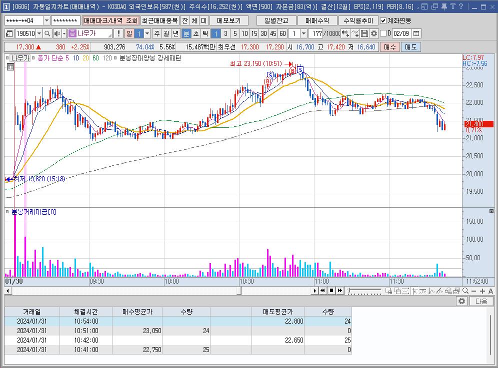 고점 진입. 욕심 탓에 익절 놓치고 손절. -4,998(-1.14%)