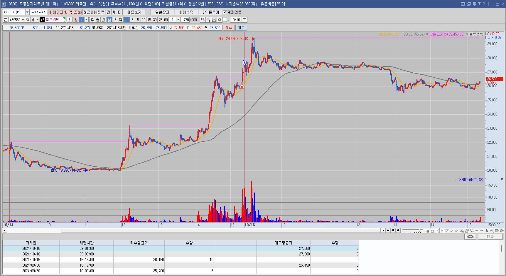 신규주. 하락하는 흐름을 강하게 돌리는 모습에 돌파 한 번만 시도하려고 스캘핑으로 매매