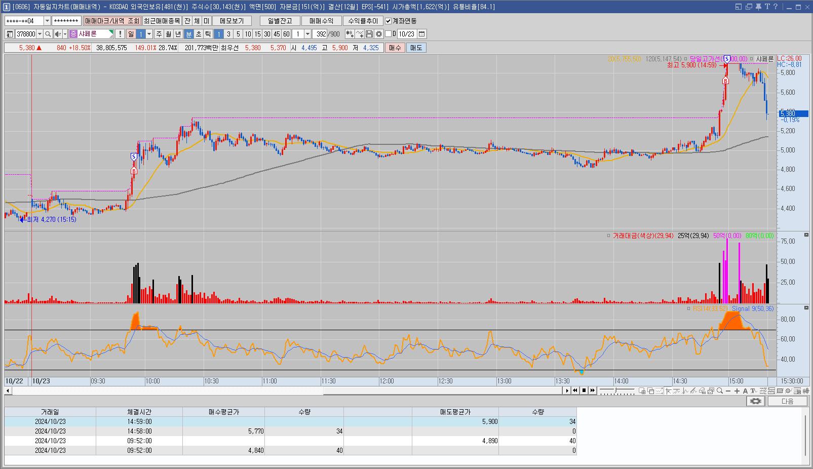 매매를 안하고 있었는데 상한가 근처까지 갔음에도 매수세가 줄지 않는 모습을 보고 절반 매수 했다가