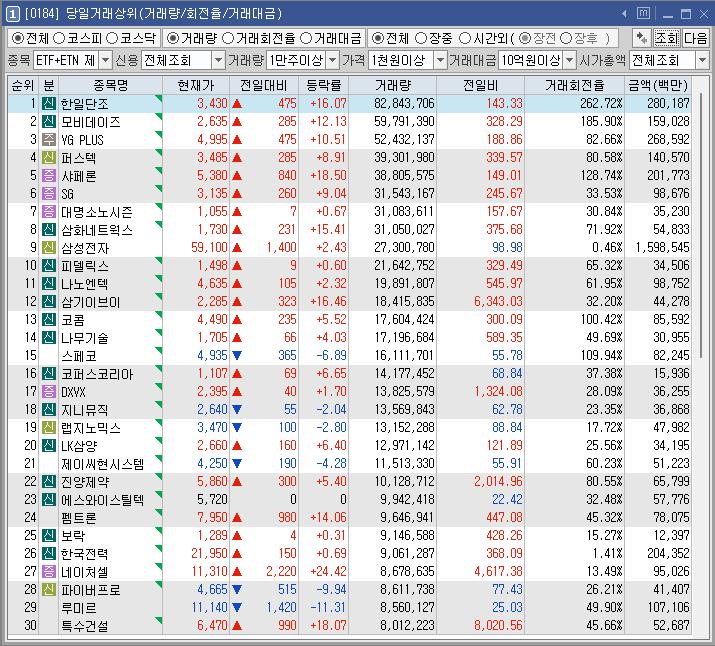 한일단조 | -2.62 | 2,157 | 단기과열종목(3거래일 단일가매매) 지정예고 투자주의]투자경고종목 지정예고 |