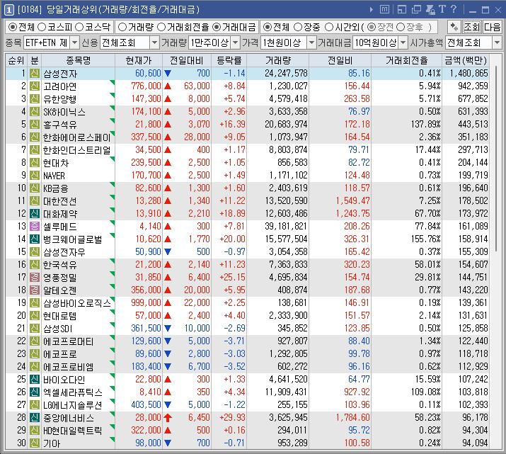 움직였으며 경영권 분쟁중인 고려아연과 반등이 나온 유한양행 등이 거래대금을 터트리며 상승했다