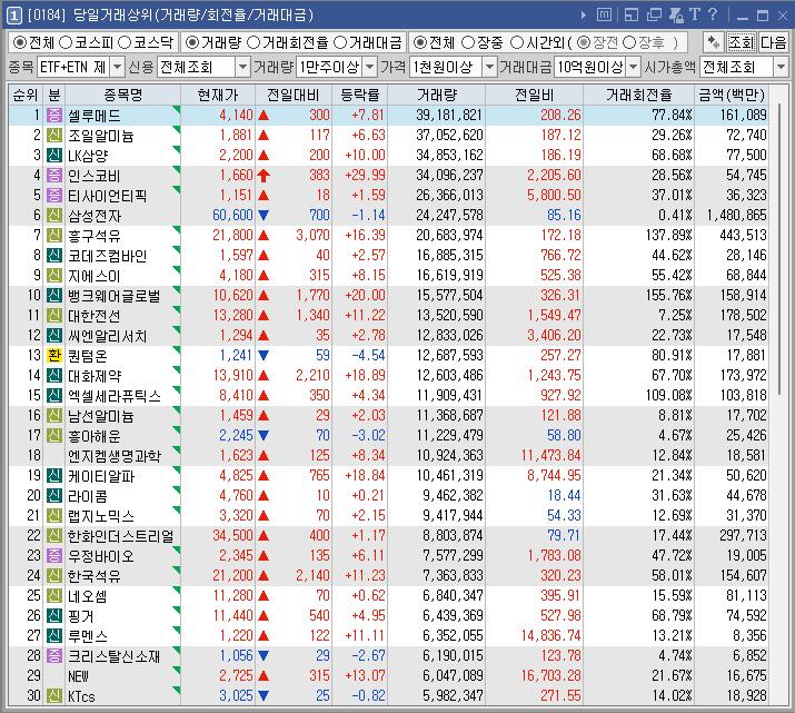 종목명 | 등락률 | 거래대금(백만) | 이유 |
