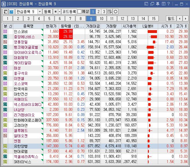 장 초반 석유주(흥구석유, 중앙에너비스 등), 바이오주(유한양행 등), 반도체주(네오셈 등), 고려아연, 조일알미늄 등이