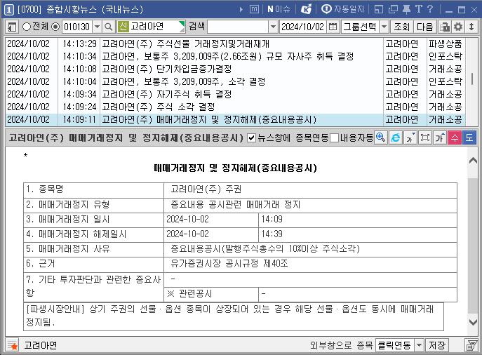 자회사 아피메즈US FDA3상 韓기업 중 최초 美 상장 기대감 광동제약으로 최대주주 변경 MBK,영풍 연합, 영풍정밀 공개매수가 상향 소식 10월 한달간 할인프로모션 진행 싱가포르서 8400억 규모 초고압 전력망 공급 수주 유상증자 권리락 신작 출시 기대감 경영권분쟁 공식화 소식 |