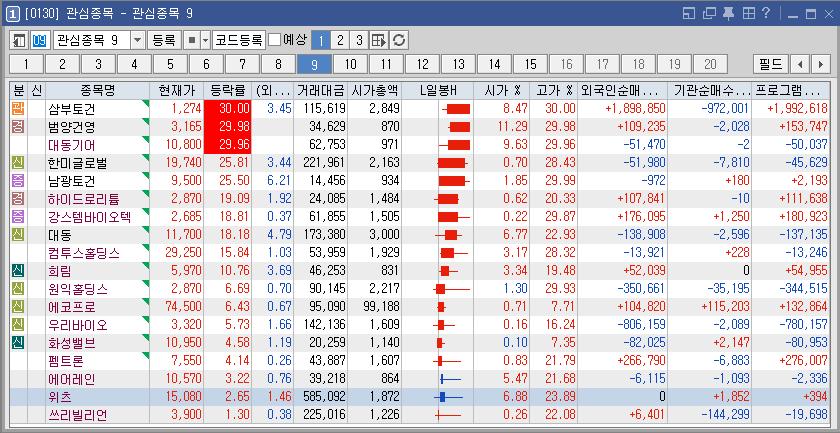 범양건영 | 29.98 | 34,360 | "푸틴, 트럼프와 평화 협상 의향…우크라 나토 포기 조건" 소식 속 우크라 재건/건설 테마 상승 |