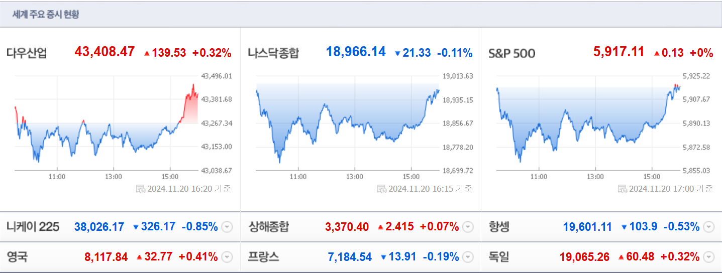 밤사이 뉴욕증시가 러-우 지정학적 긴장 고조에도 엔비디아 실적 대기 속 혼조세