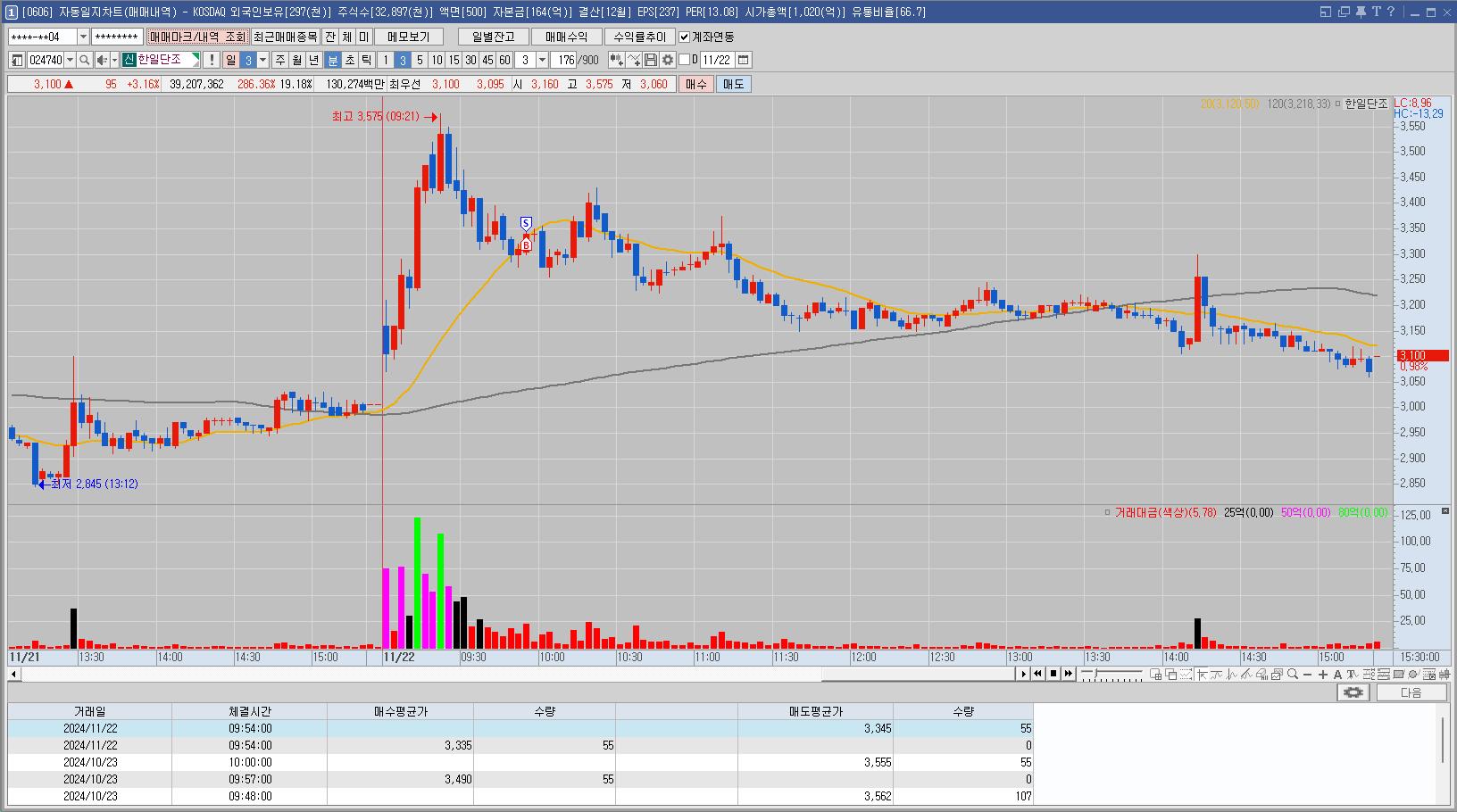 전일 상한가인데 시가갭 낮게 뜨고 밀리는 모습에 시가 돌파에 접근