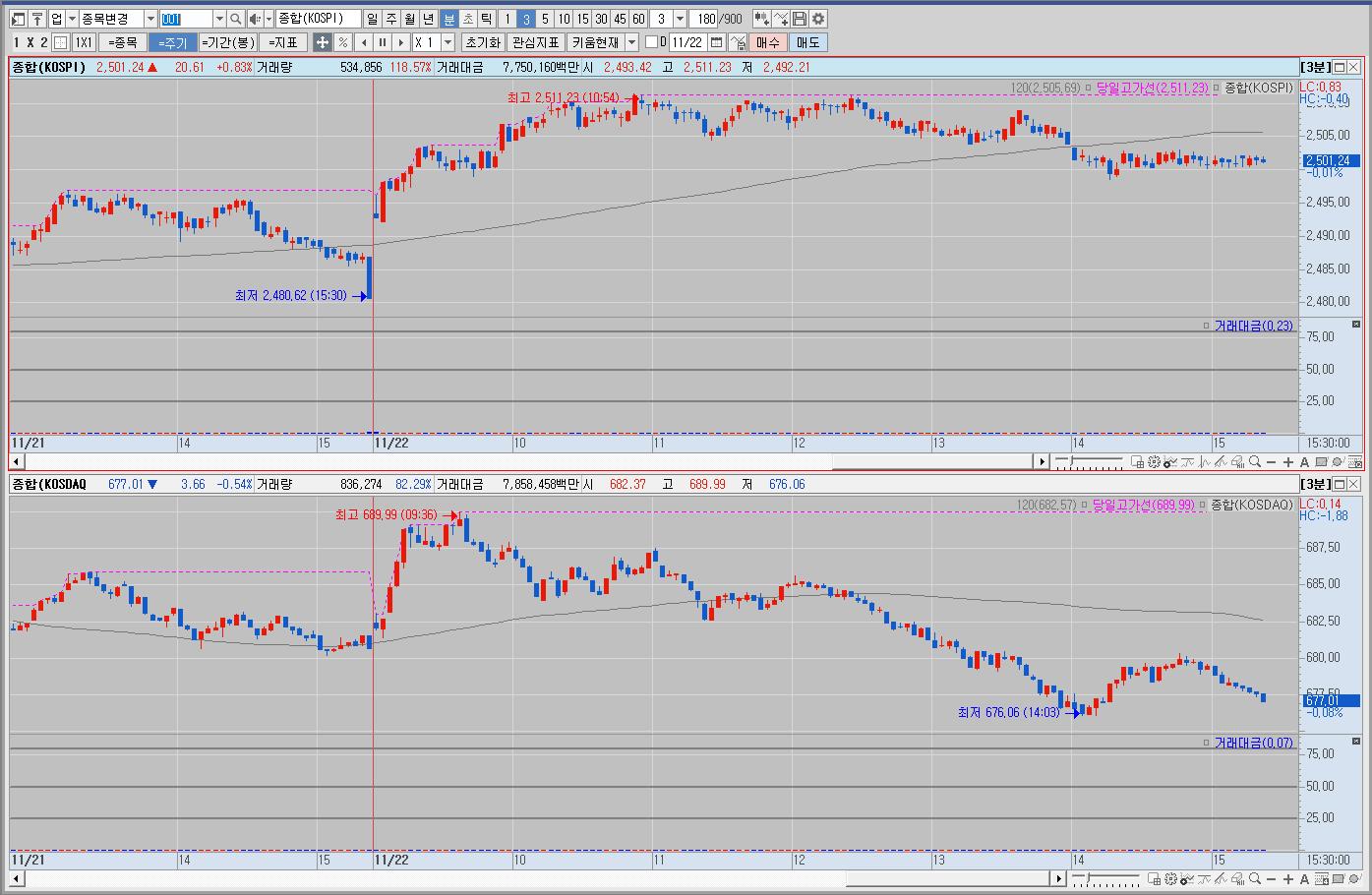 우리 시장은 상승 출발했으나 후반으로 갈수록 약해짐(전강후약)