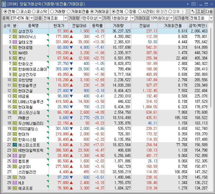 신라젠 | 12.69 | 13,088 | 인수합병(M&A) 기대감 지속 |
