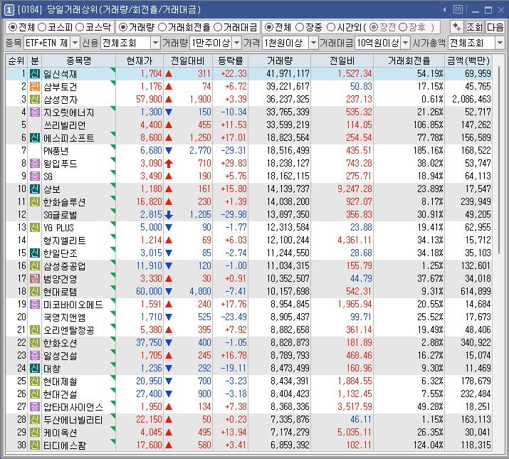 일성건설 | 16.78 | 14,798 | 이재명, 위증교사 혐의 1심 '무죄' 소식 속 이재명 테마 강세 |