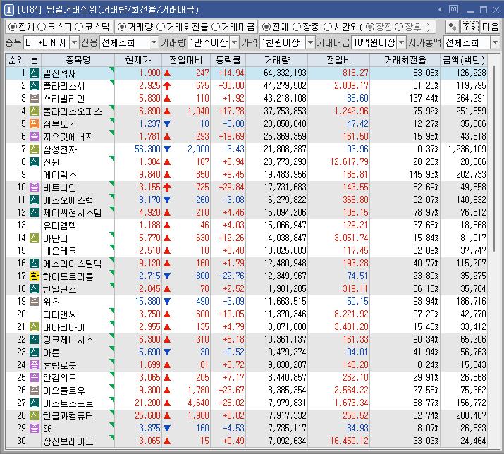 이스트소프트 | 28.02 | 154,451 | 트럼프, 백악관에 'AI 차르' 임명 검토 소식에 AI 테마 강세 AI 검색 엔진 내달 출시 소식 |
