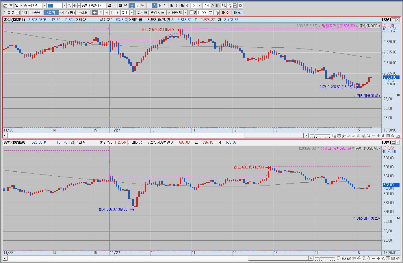우리나라는 약보합으로 시작해서 초반 혼조세를 보이다가 보합권에서 등락하며 하락