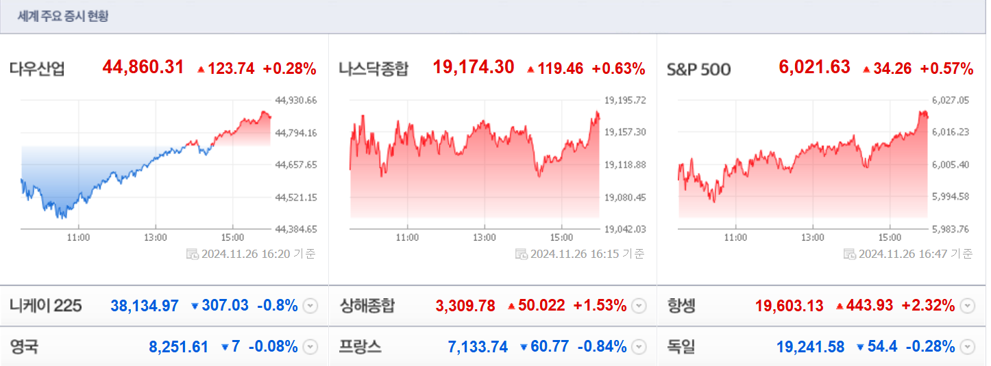 지난 밤 뉴욕증시는 점진적 금리인하 강조 FOMC 의사록 공개, 이스라엘-헤즈볼라 휴전 소식 등에 상승