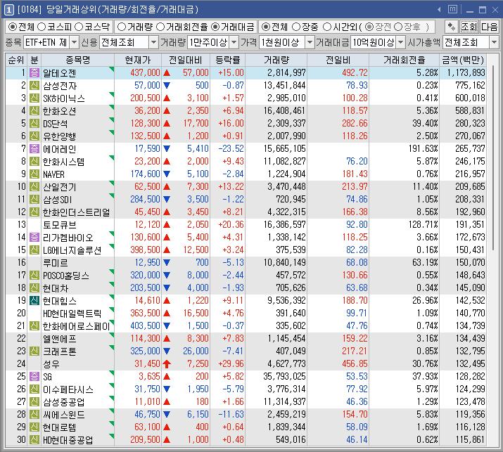 오후에는 알테오젠이 매우 좋은 호재 뉴스로 거래대금을 쓸어가며 급등을 했다