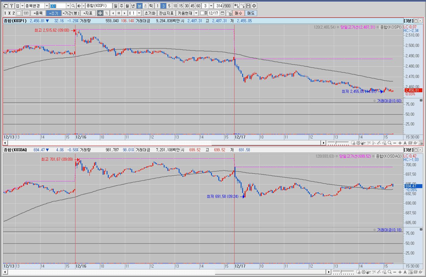 우리나라는 약보합 출발해서 점차 하락세