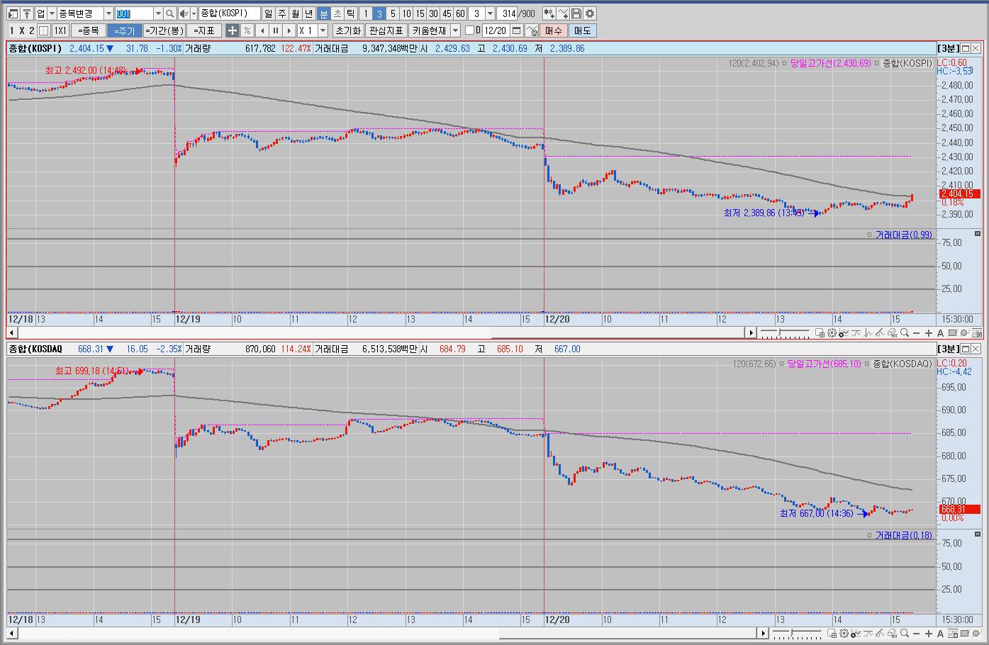 우리나라는 하락 출발해서 낙폭을 확대하다가 줄이면서 마감