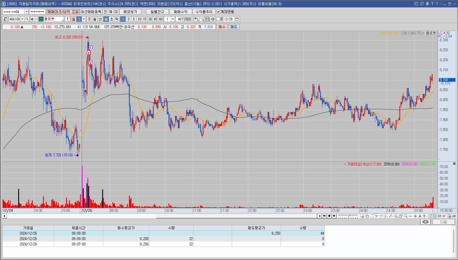로봇관련주들이 올라가고 있었고 씨메스가 가장 상승률이 좋았으나 클로봇을 보기로 했어서 매매를 했는데
