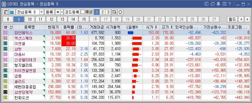 삼천당제약 | 9.08 | 189,681 | 아일리아 시밀러 美 독점 판매 계약 소식 지속 |
