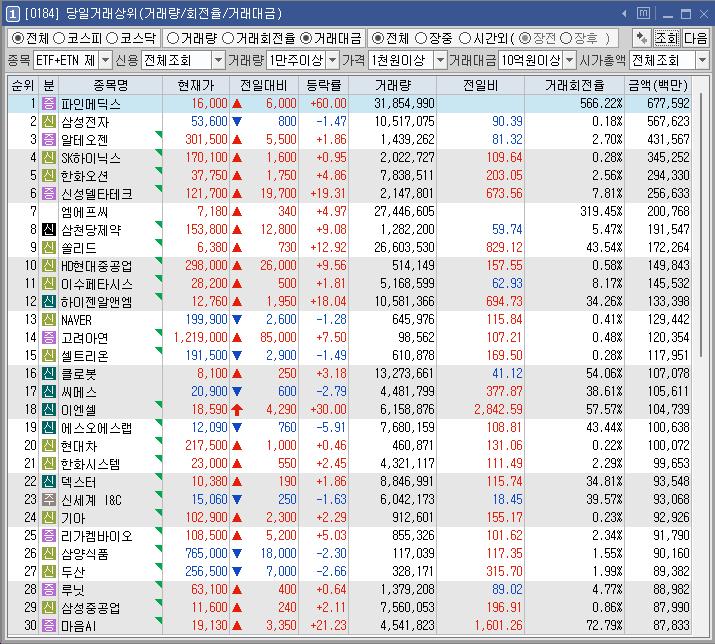 신성델타테크 | 19.31 | 254,045 | 퀀텀에너지연구소 전도성 구조체 등 특허 출원 소식 속 초전도체 테마 강세 |