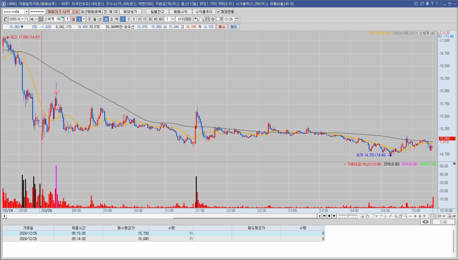 그 후 지켜보는데 다시 상승하려고 하는 모습에 2차 매수를 했는데 하락하는 모습에 손절해서 수익을 거의 반납