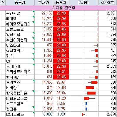 이스타코 | 29.88 | 2,413 | 비상계엄 선포·해제 이후 윤석열 대통령 퇴진 요구 나오면서 이재명 테마 강세 |