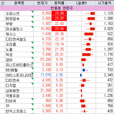 오리콤 | 19.14 | 7,380 | 비상계엄 선포·해제 이후 윤석열 대통령 퇴진 요구 나오면서 한동훈 테마 강세 |