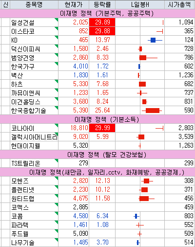 일성건설 | 29.89 | 5,096 | 비상계엄 선포·해제 이후 윤석열 대통령 퇴진 요구 나오면서 이재명 테마 강세 |