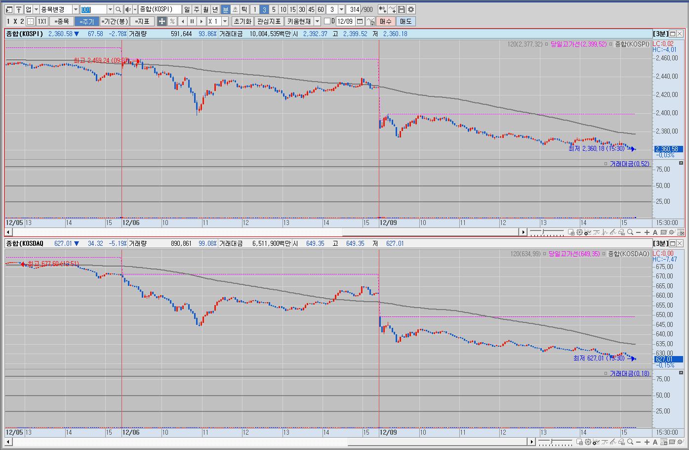 우리나라는 정국 혼란 지속 등에 갭하락 출발해서 낙폭을 키워 큰 폭 하락