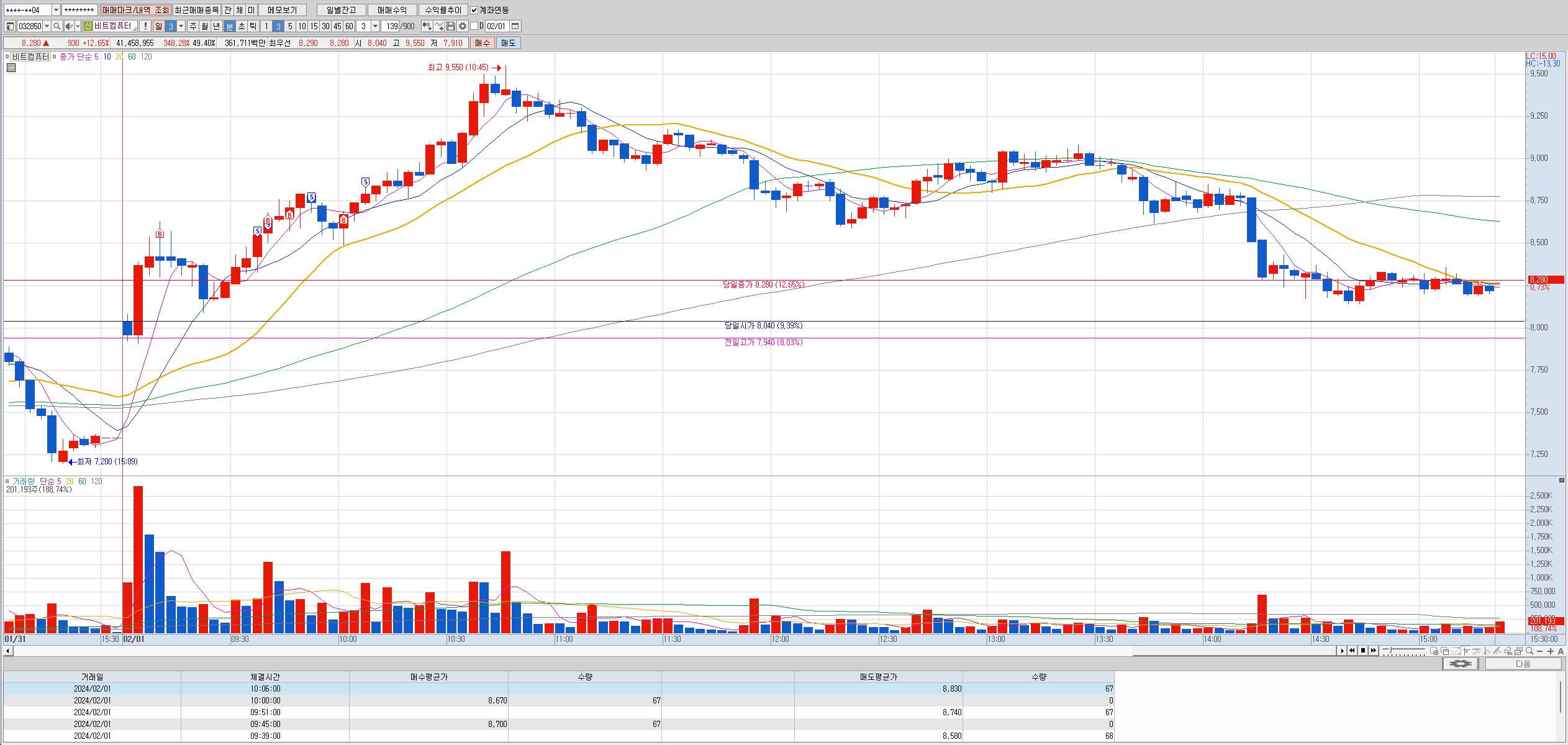 강한 매수세에 낚여서 첫 진입을 잘 못했다. 눌림에 매수타점을 잡아야 하는데 손이 말을 안 듣고 더블 클릭을 했다.