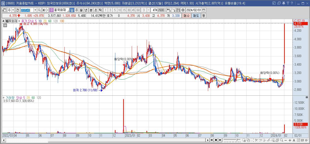 HDC | 7.46 | 1,547 | 23년 연결 영업이익 3,178.34억원으로 전년대비 100.48% 증가 보통주 2,000,000주(146.40억원) 규모 자사주 취득 결정 |