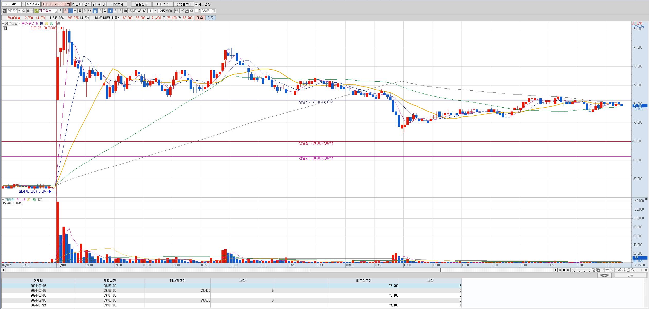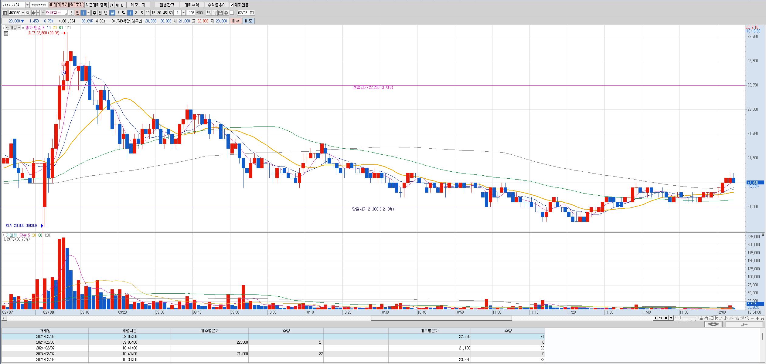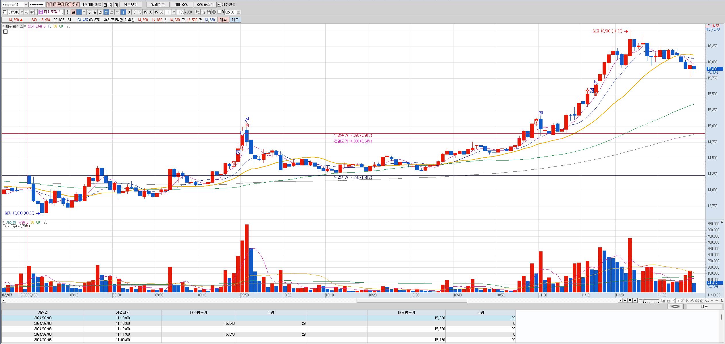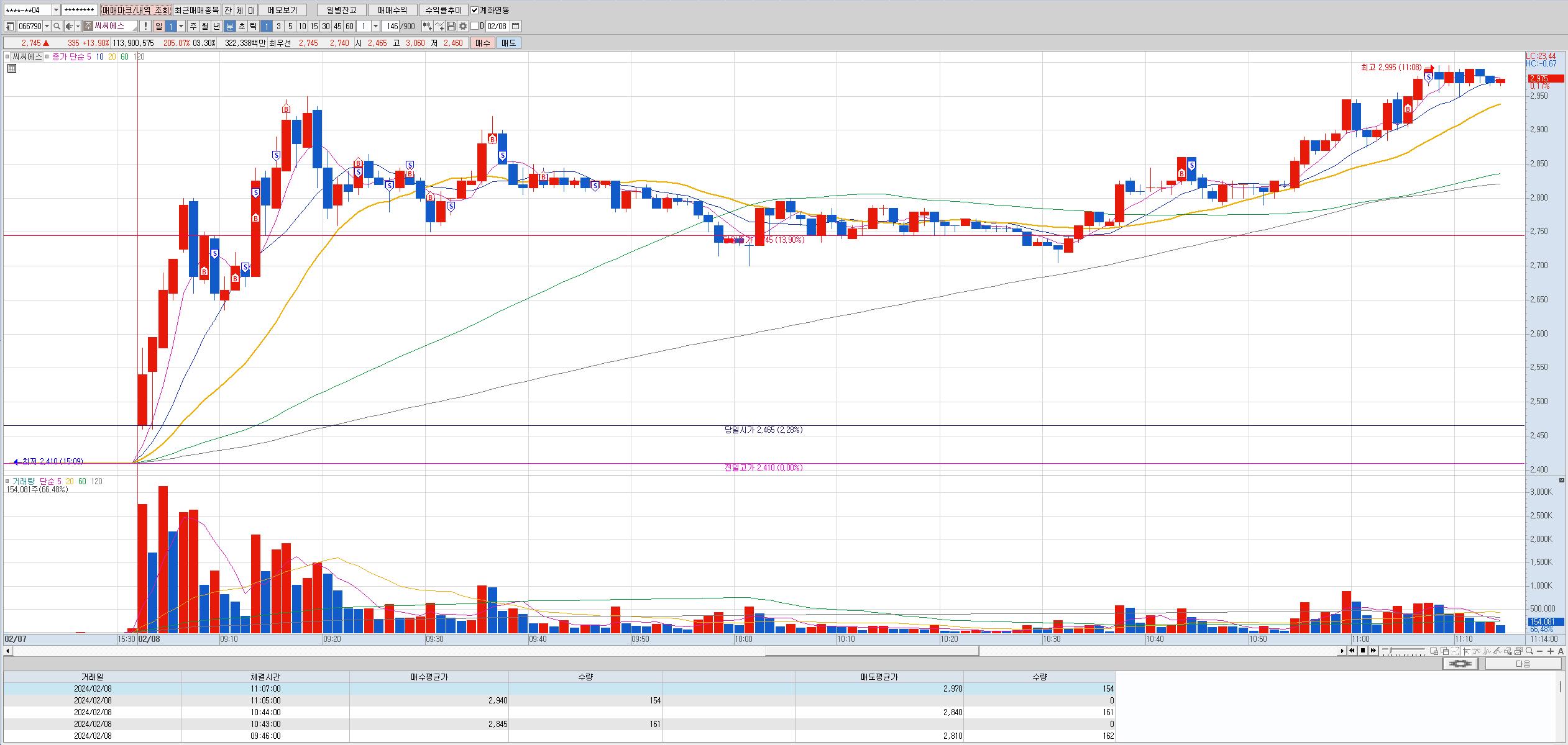 뉴스를 봐서 이 종목이 강할 줄 알았는데 초반에 미지근하길래 안 가는가 했더니 어느 순간 가고 있었다. 이렇게 강할 줄 알았으면 매수하고 기다렸으면 됐을 텐데 자잘한 봉에 신경 쓰느라 큰 그림을 못 봤다. 대부분 매매를 잘했으나 중간중간 손절한 부분이 많았고 자주 거래하면서 수수료가 많아 수익을 못 냈다. 매수, 매도를 호가창과 순간체결창을 보고 해 보려다가 좋은 구간을 자꾸 놓치는 것 같다.