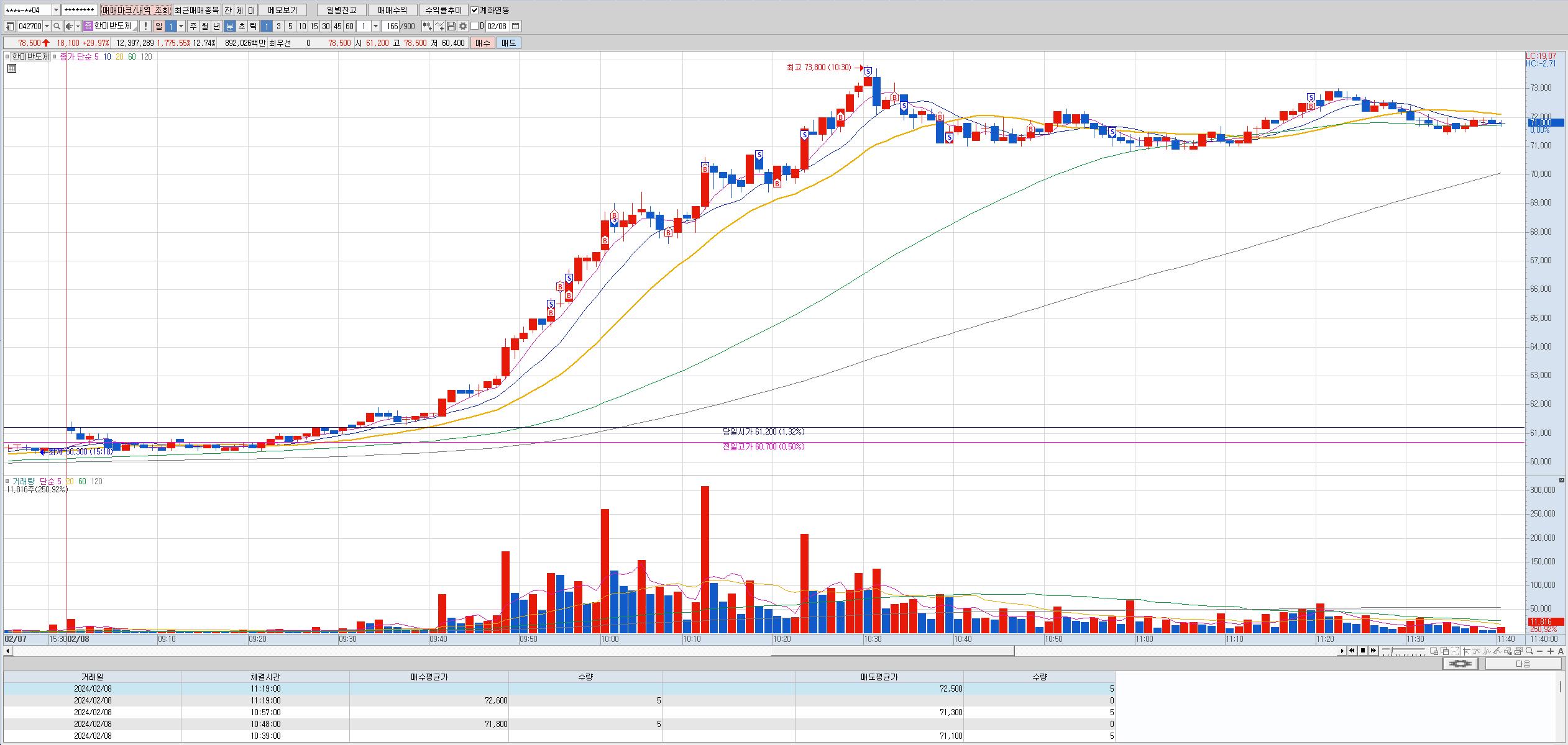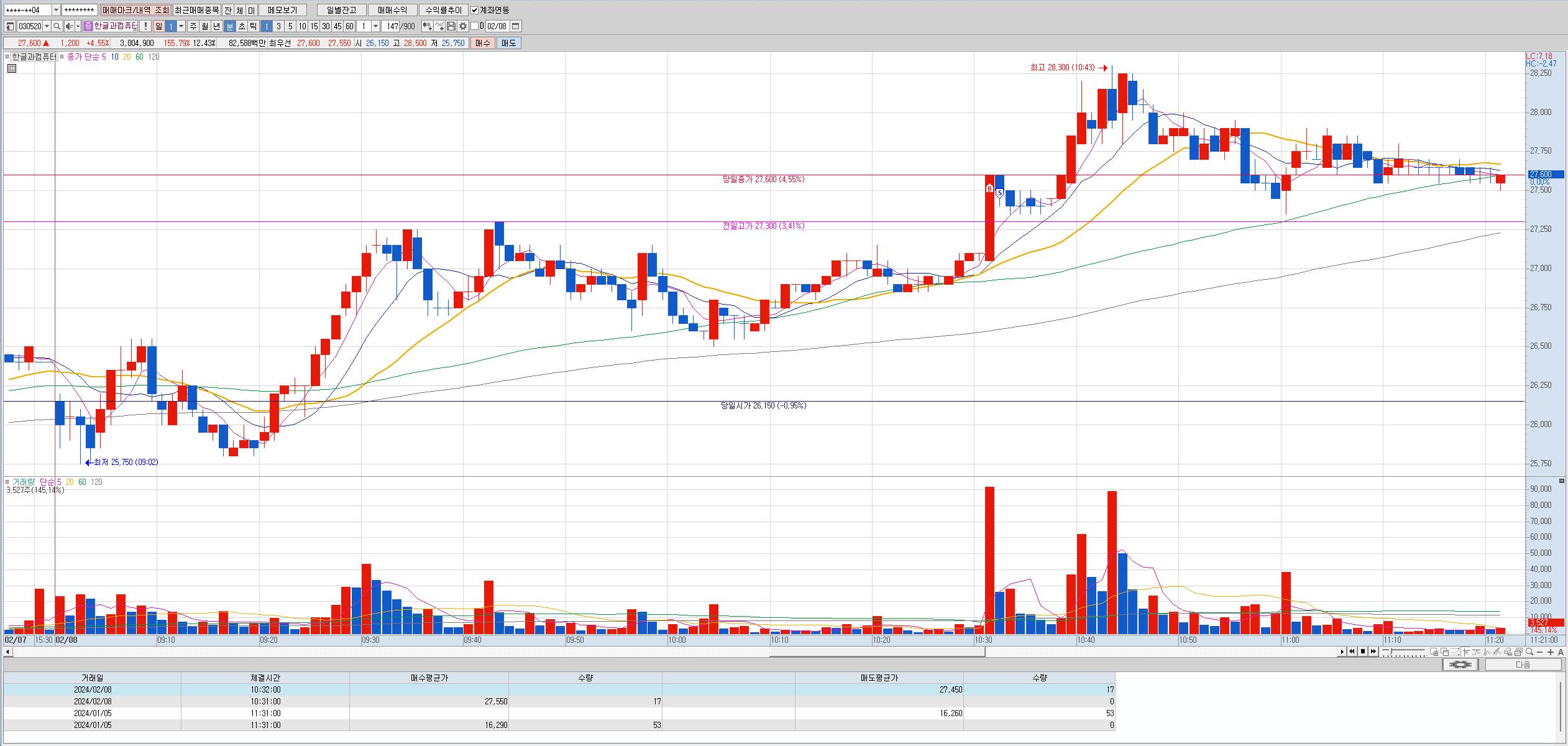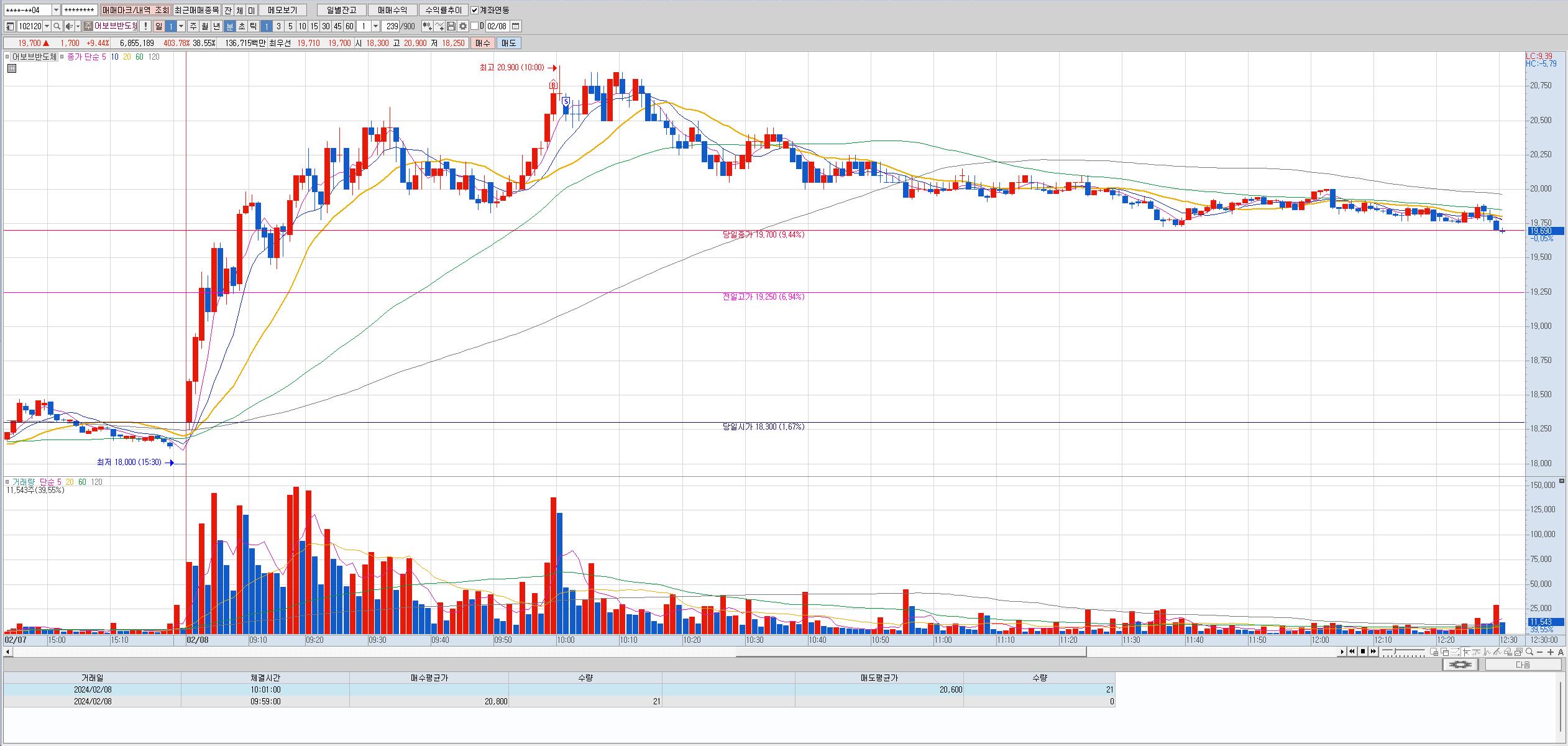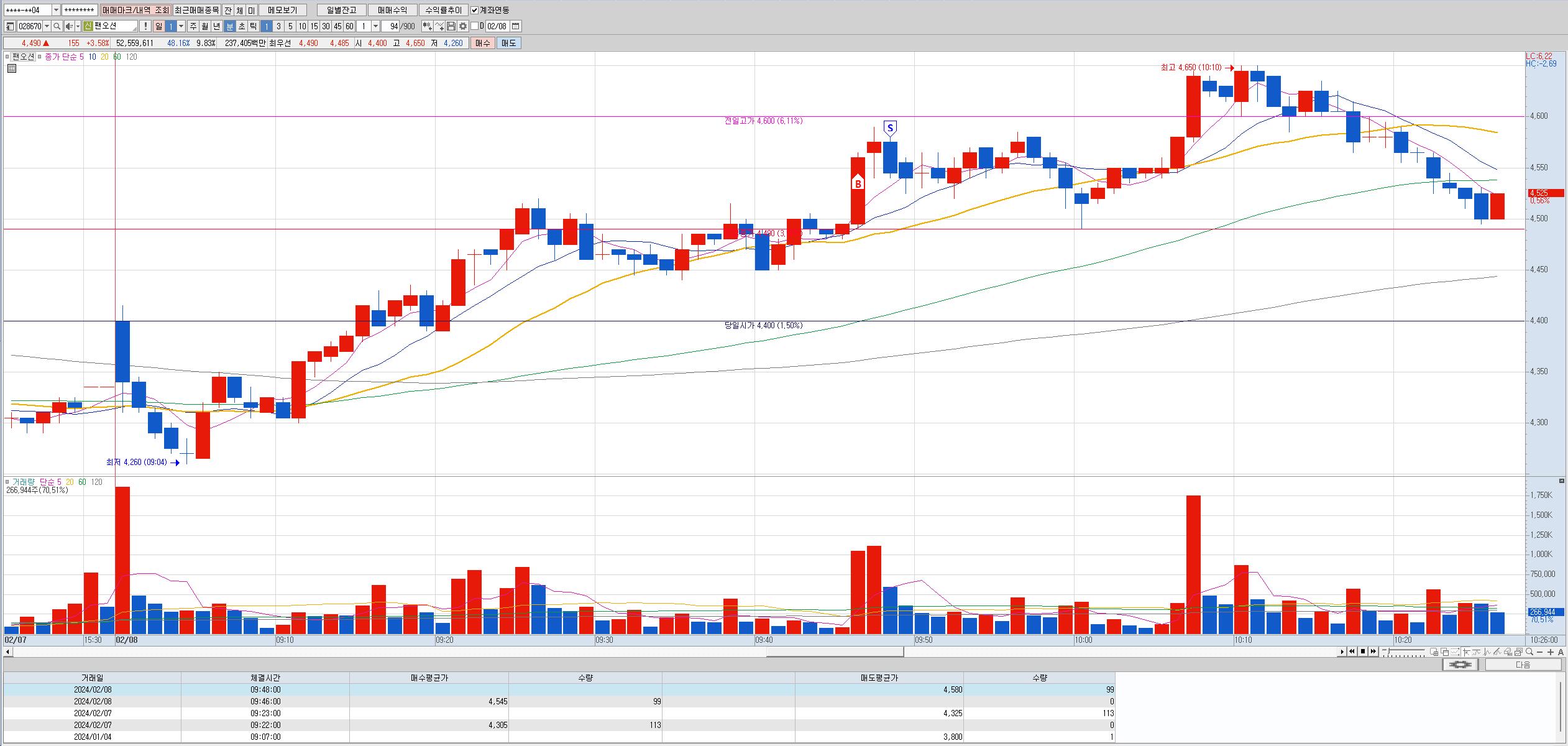 뉴스를 봐서 이 종목이 강할 줄 알았는데 초반에 미지근하길래 안 가는가 했더니 어느 순간 가고 있었다. 이렇게 강할 줄 알았으면 매수하고 기다렸으면 됐을 텐데 자잘한 봉에 신경 쓰느라 큰 그림을 못 봤다. 대부분 매매를 잘했으나 중간중간 손절한 부분이 많았고 자주 거래하면서 수수료가 많아 수익을 못 냈다. 매수, 매도를 호가창과 순간체결창을 보고 해 보려다가 좋은 구간을 자꾸 놓치는 것 같다.