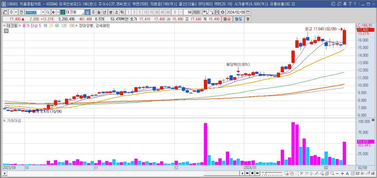테크윙 | 1.38 | 5,045 | 엔비디아 3% 급등, 필라델피아반도체지수 1.62%상승, Arm 실적 시장 예상 상회 소식 속 반도체 테마 상승 |