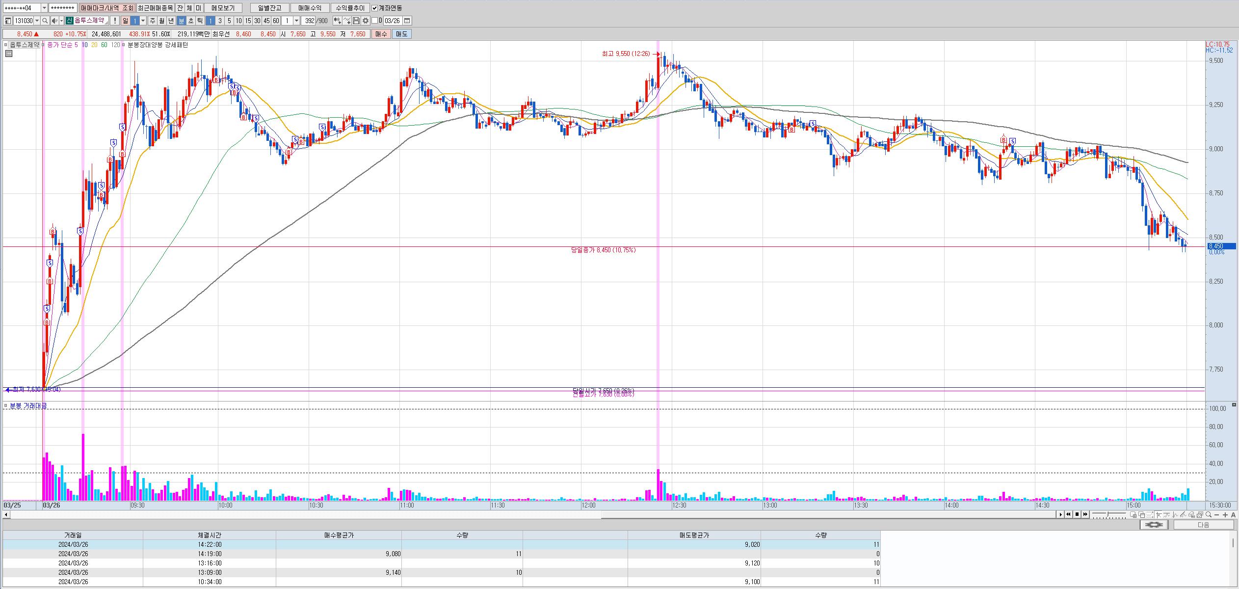 예상체결에서 삼천당제약은 갭이 떴는데 옵투스제약은 갭은 약하지만 재료가 너무 좋고 바닥이라 더 오를듯 해서 시초가부터 지켜보던중 시작부터 달리기에 매수하고 계속 매매를 했다