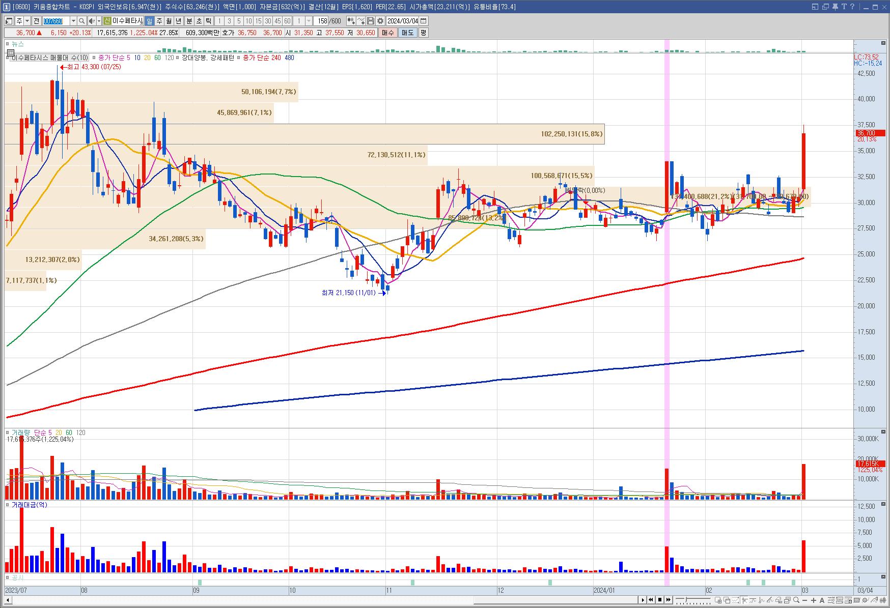 KD 30.00 3,126 23년 연결기준 영업이익이 97.37억원으로 전년대비 흑자전환