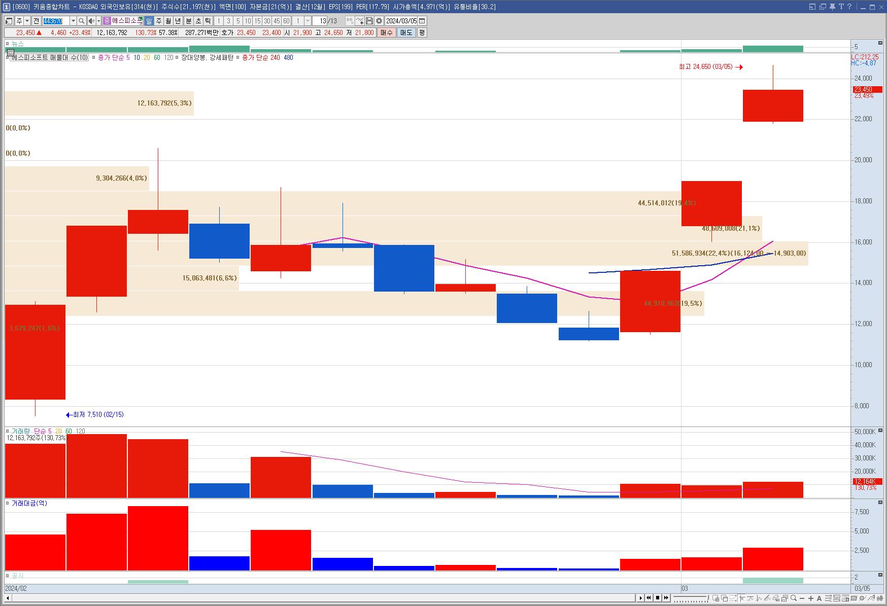에스피소프트 [신규주 강세장. 2일 상한가 후 오늘 상한가 도달 후 풀렸으나 강세 유지]