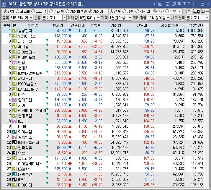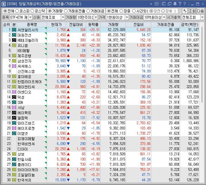 유니셈 | 22.38 | 325,965 | 美, 삼성전자에 약 9조원 반도체 보조금…역대 3번째 규모 소식 속 반도체 테마 상승 엔비디아 1.64% 상승, 필라델피아반도체지수 0.89% 상승 |