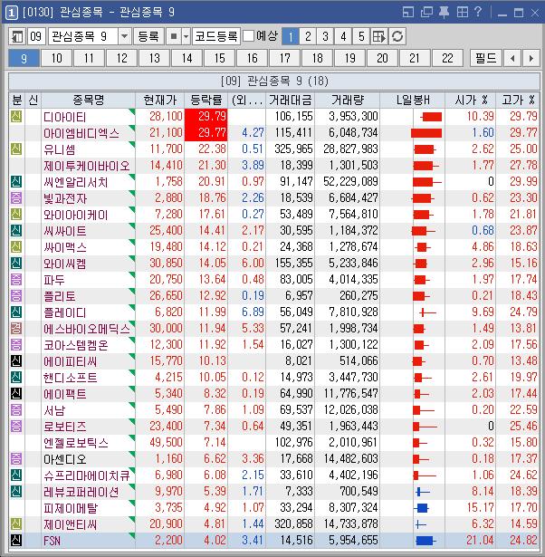와이씨켐 | 14.05 | 155,355 | 美, 삼성전자에 약 9조원 반도체 보조금…역대 3번째 규모 소식 속 반도체 테마 상승 엔비디아 1.64% 상승, 필라델피아반도체지수 0.89% 상승 |