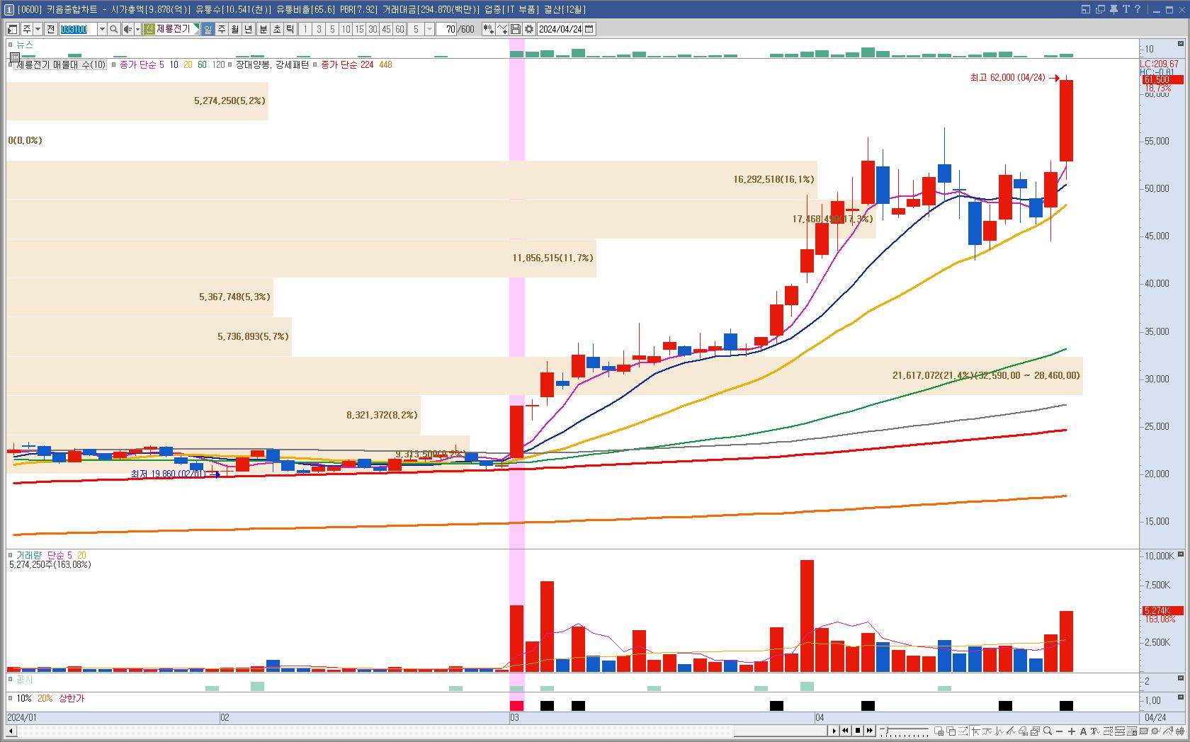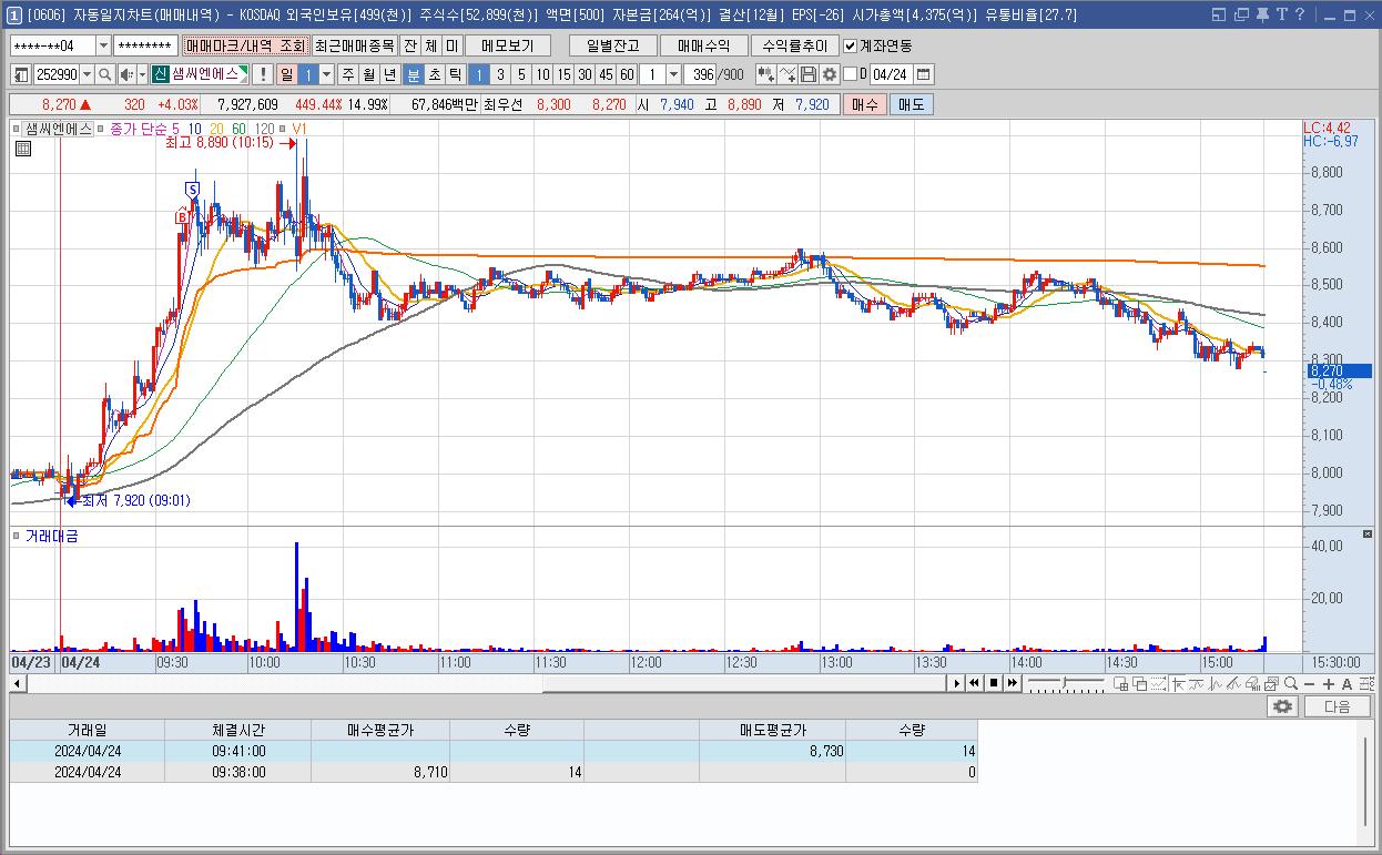 눌림에 진입했으나 하락폭이 커서 손절. 이후 슈팅이 나왔으나 순식간이어서 재진입 못했다