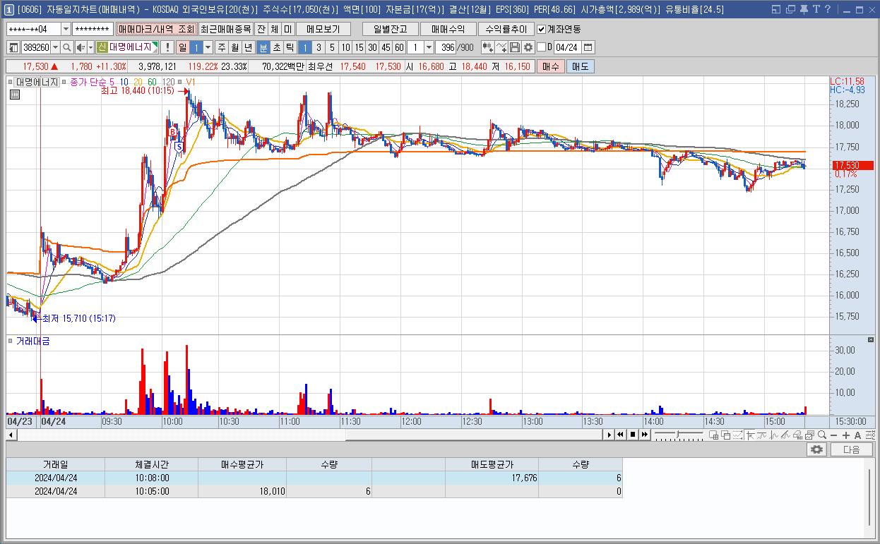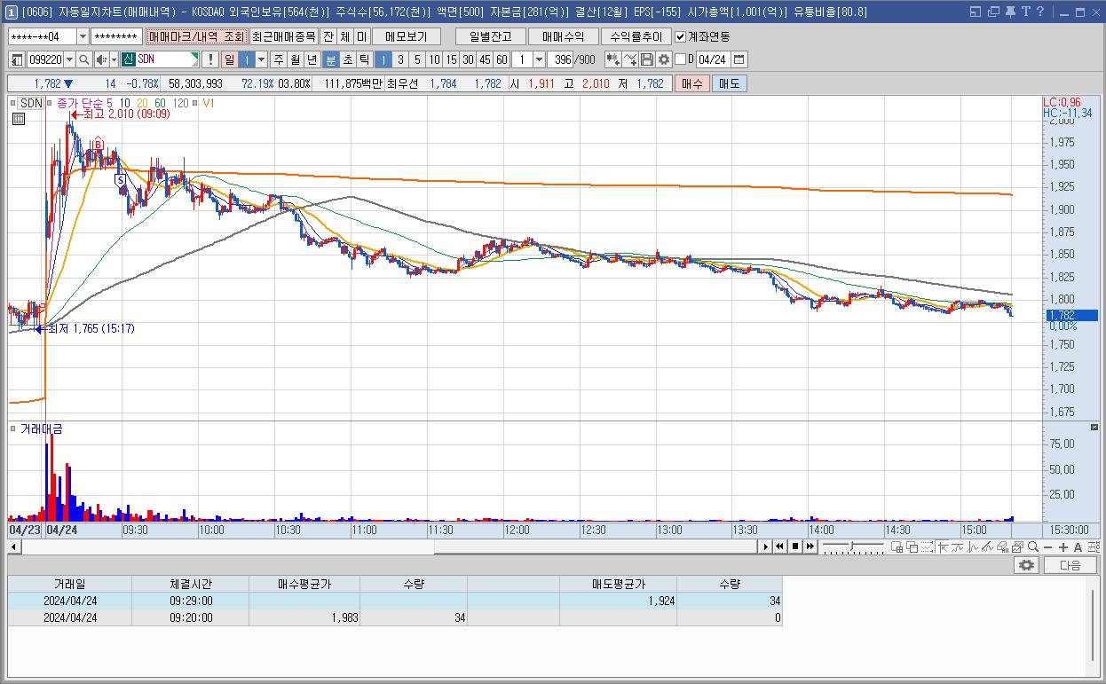 심상치 않은 모습에 매매를 하게 되었는데 등락이 심해서 매매하기 어려웠다