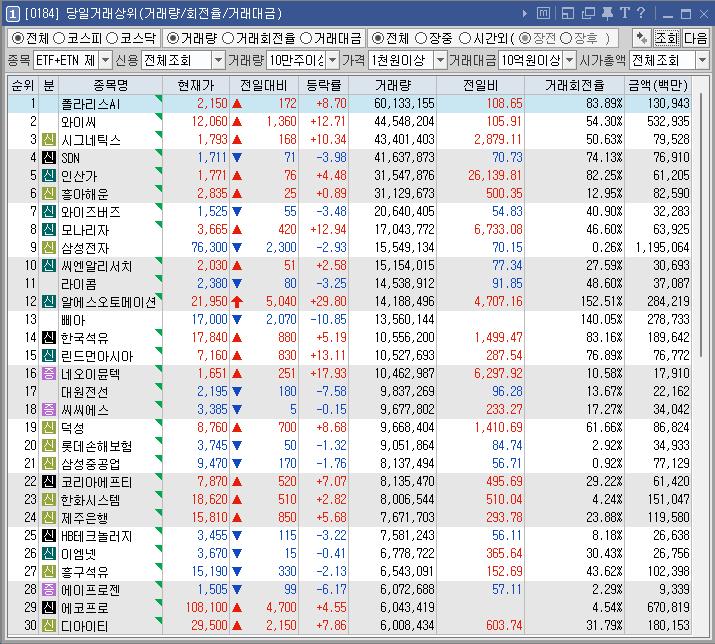 삐아 | -4.88 | 4,818 | 투자주의]단일계좌 거래량 상위종목 |