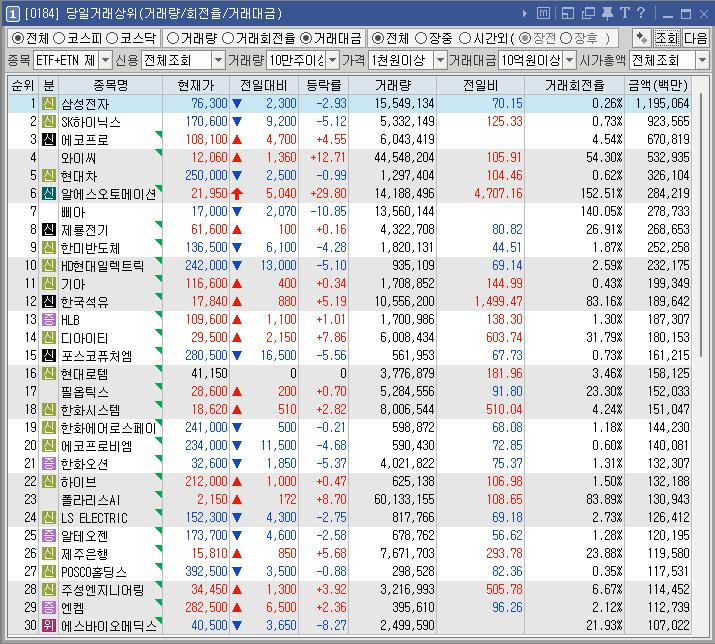 와이씨 | 12.71 | 528,363 | 삼성전자에 335억원 규모 장비 공급 계약 소식에 강세 필라델피아반도체지수 1% 상승 소식 속 반도체 테마 상승 |