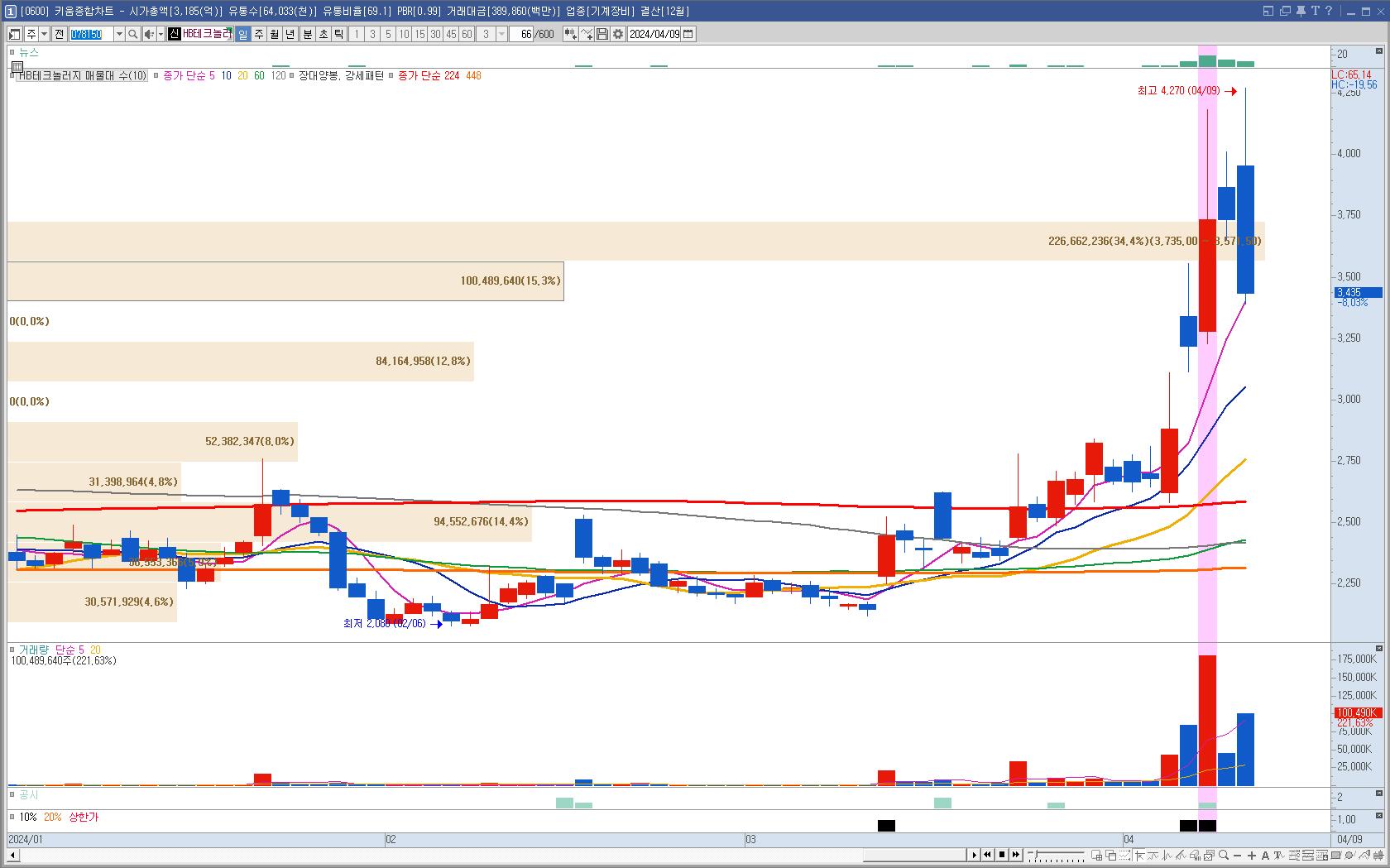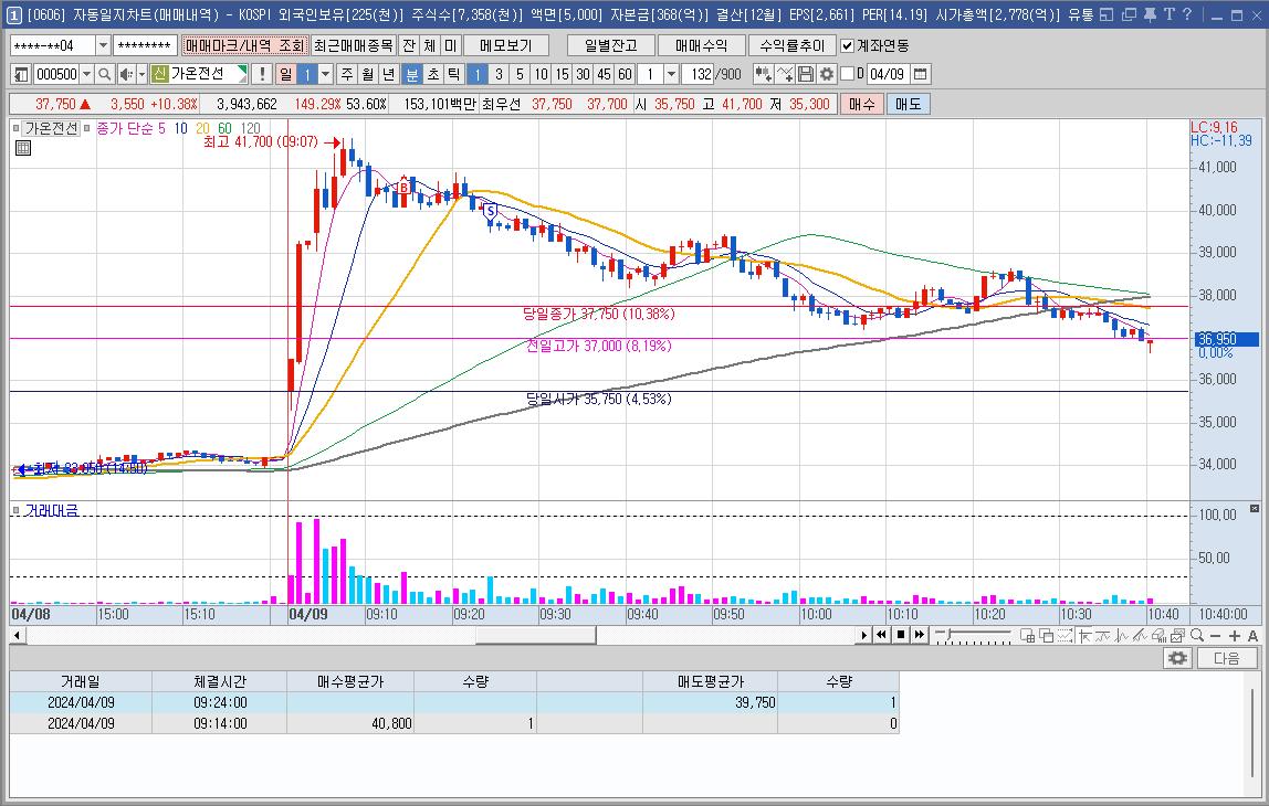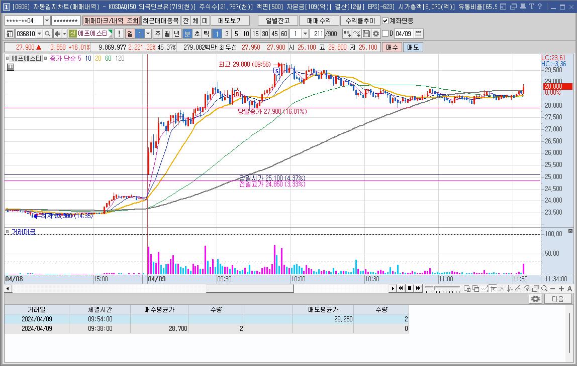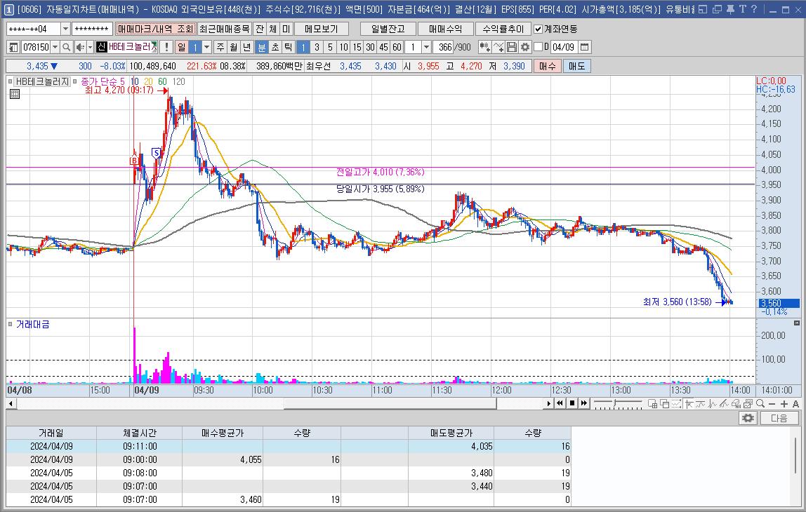 HB테크놀러지만 가고 다른 종목들은 내려가고 있어서 께름칙했지만 오르는 모양에 바로 매수