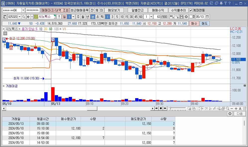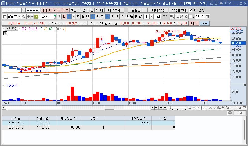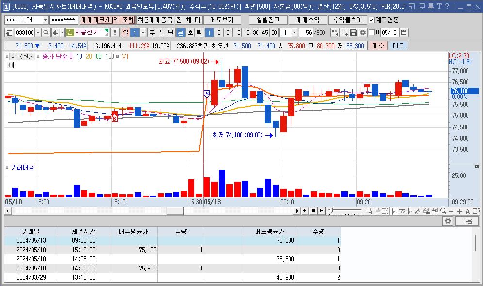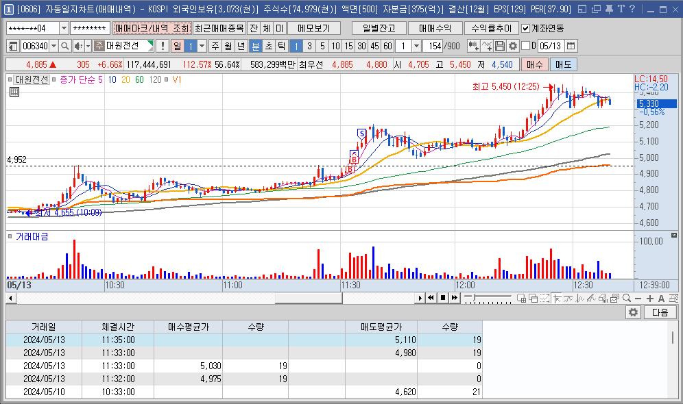 매매 중간에 손님이 와서 나가는 바람에 대한전선의 좋은 구간을 다 놓쳐서 매수 진입이 애매해서