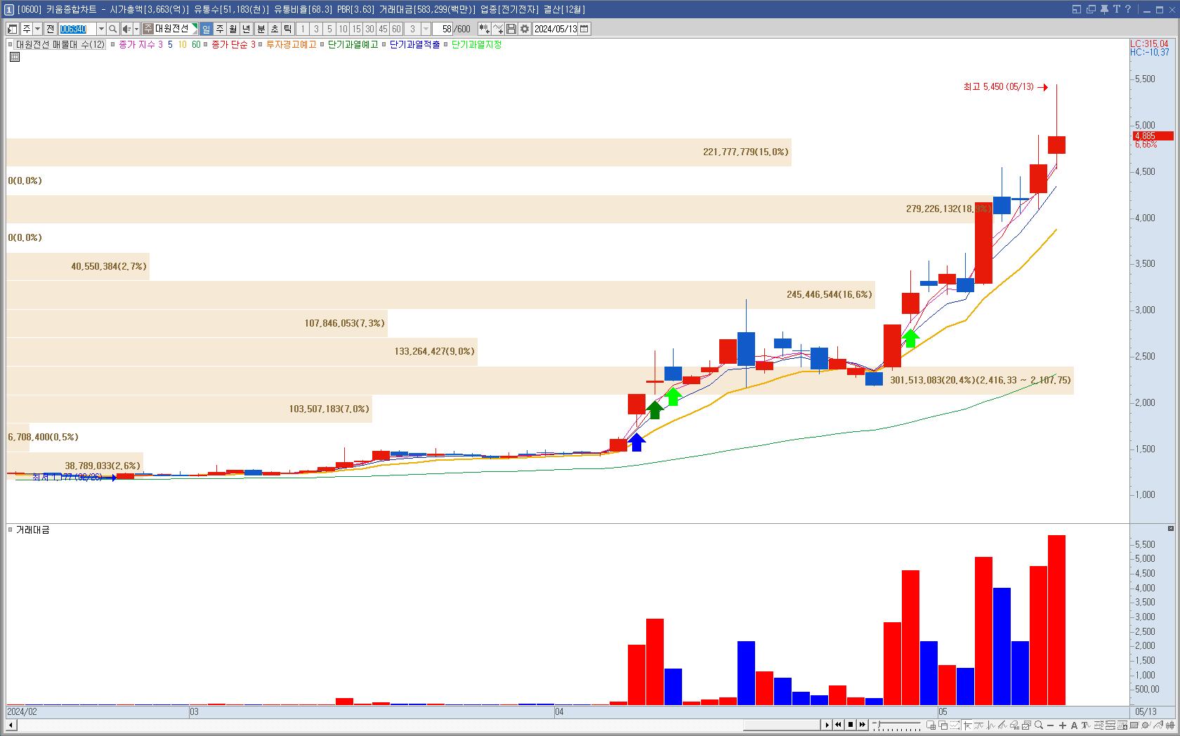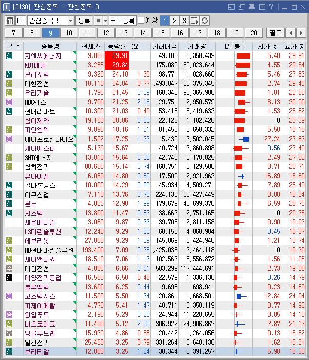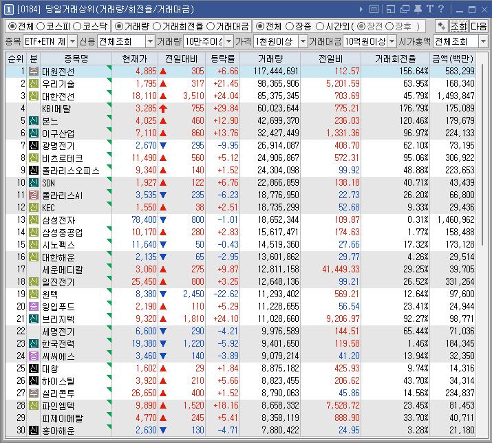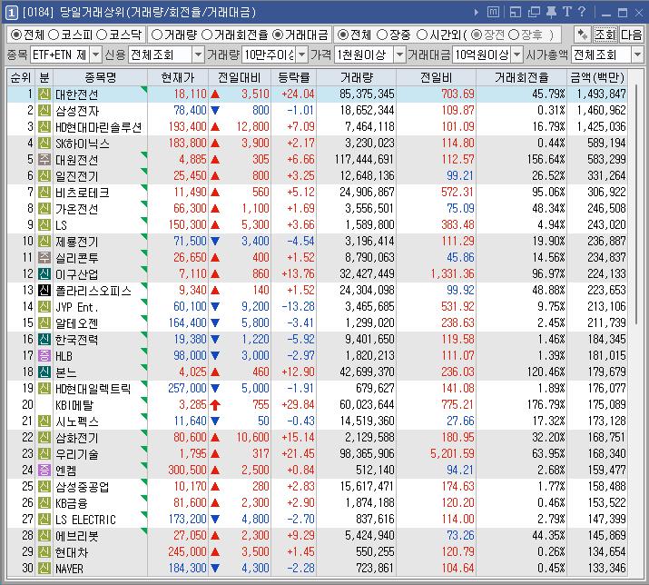 거래대금이 삼성전자보다 많이 터진 대한전선을 하려고 했으나 시총이 무거워보여서