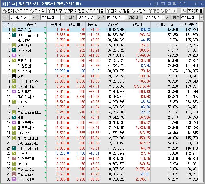 이수페타시스 | 18.83 | 932,892 | 매출액 1996억 원과 영업이익 230억 원으로 컨센서스를 각각 10%, 40% 상회 호실적에 강세 엔비디아 3.58% 급등, 필라델피아반도체지수 2.88% 상승 소식 속 반도체 테마 상승 |
