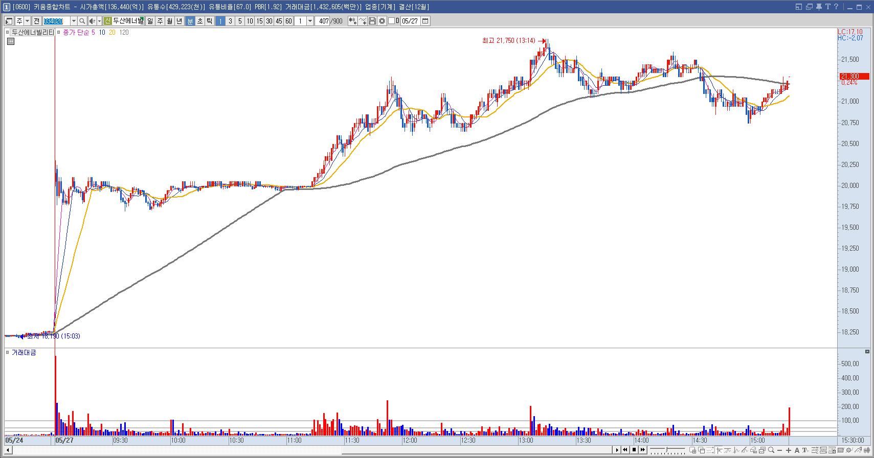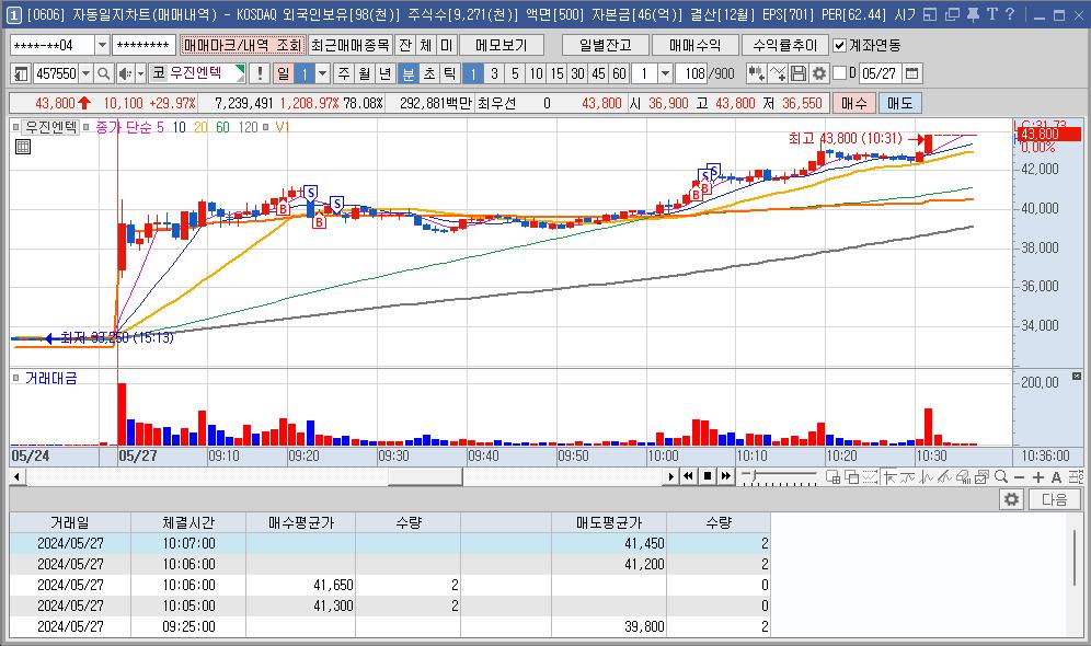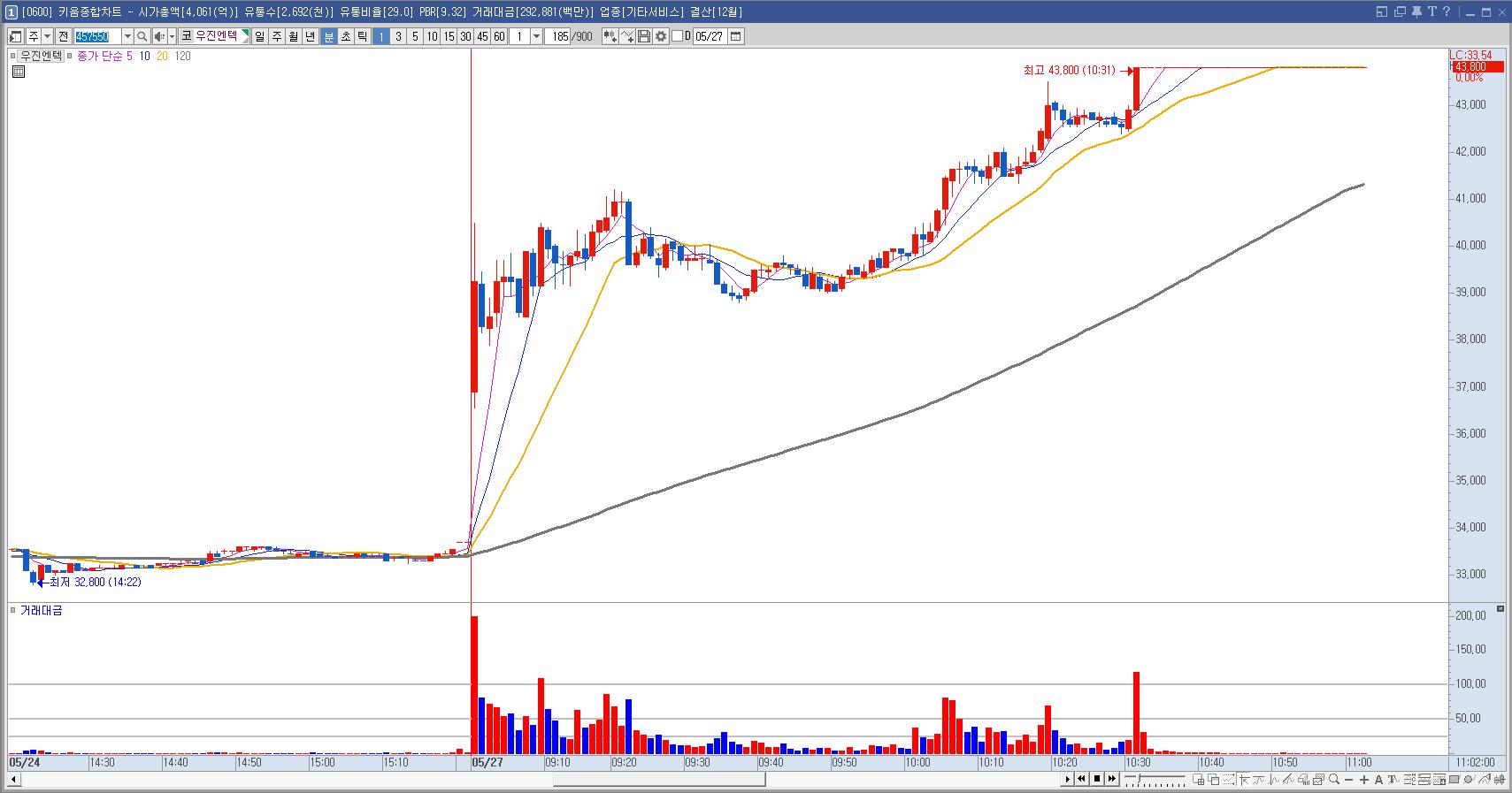 오늘 매우 강했던 종목. 시가가 너무 높게 떴는데 계속 횡보하는 모습에 매수를 안하려 했는데