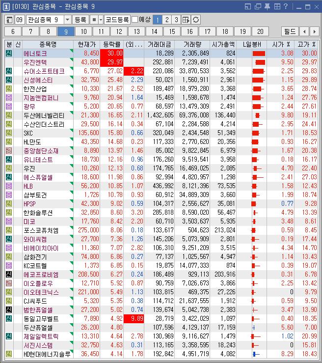 에너토크 | 30.00 | 18,284 | 두산에너빌리티의 美 뉴스케일 50조 SMR 프로젝트에 대규모 납품 소식과 정부의 체코 원전 프로젝트 계획 기대감 속 원전 테마 강세 |